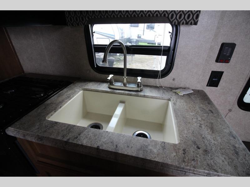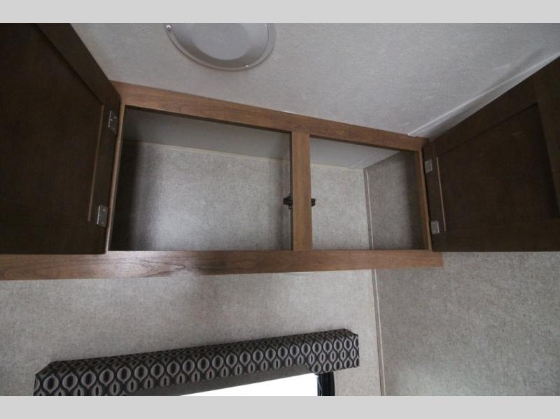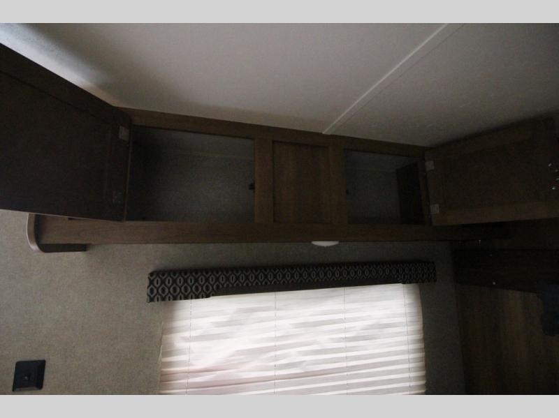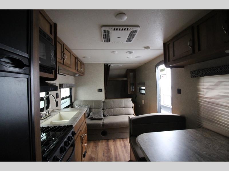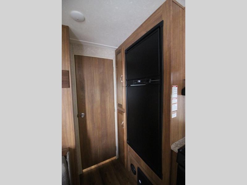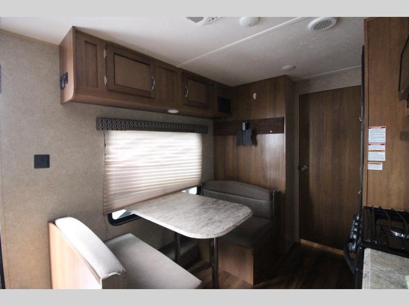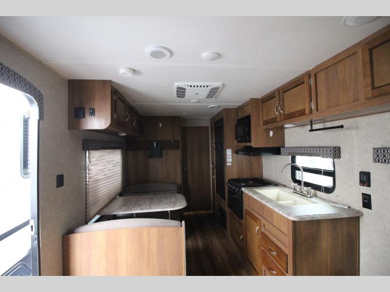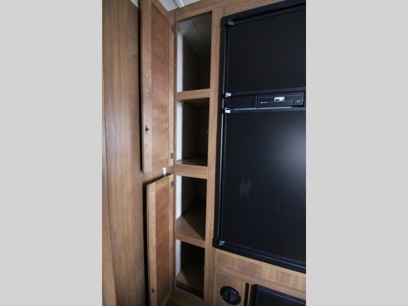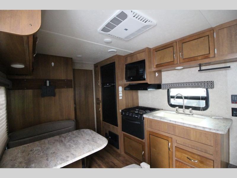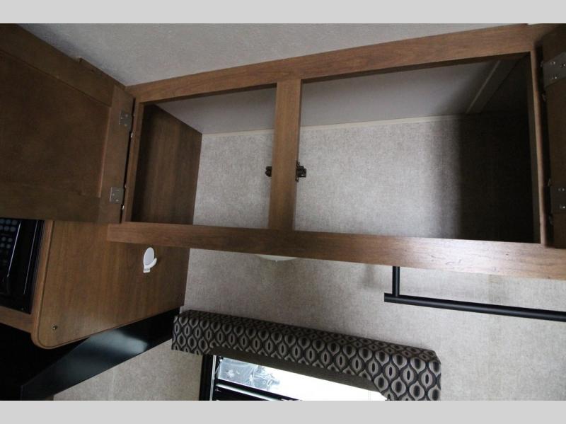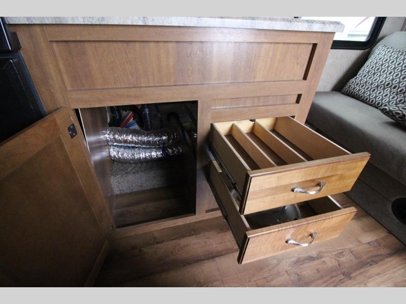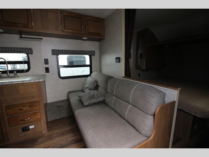 In the combined kitchen and living space you will find seating at the sofa located straight in through the entry door along the stub wall, and also at the booth dinette located to the left of the same door. You can add a TV along the wall above the dinette as there is a TV mount available, plus additional storage in the overhead cabinets will come in handy as well.