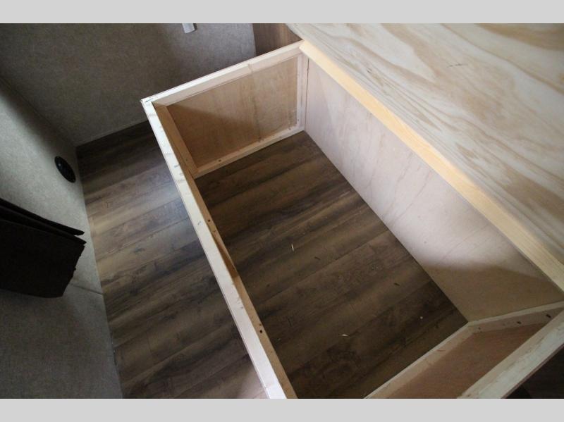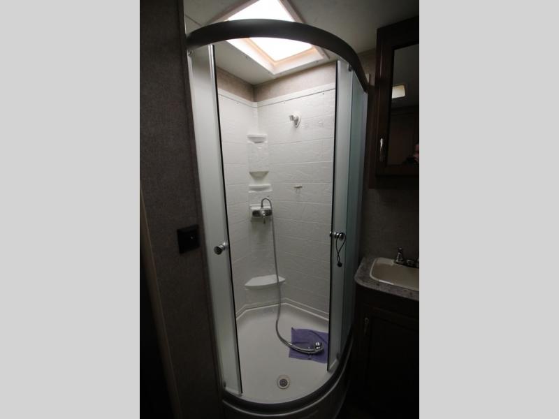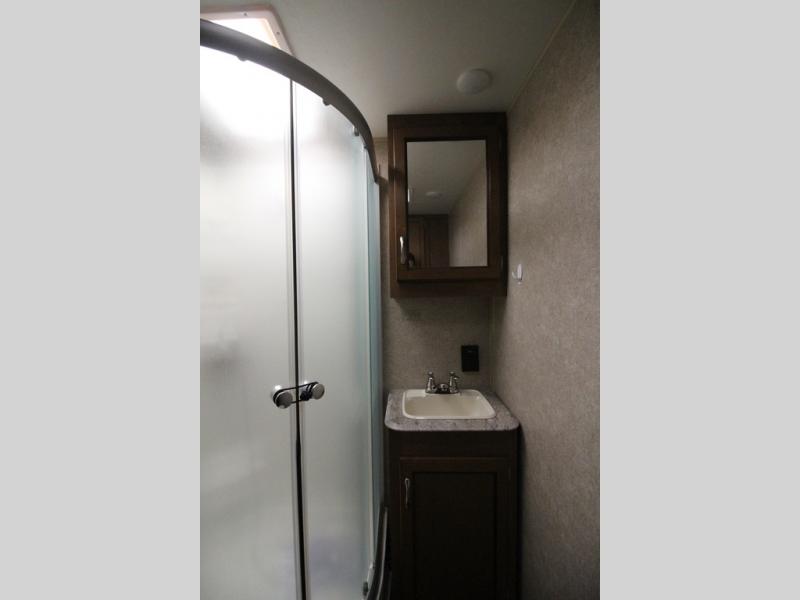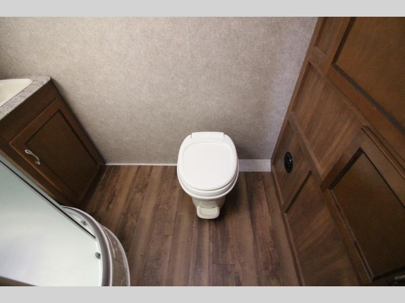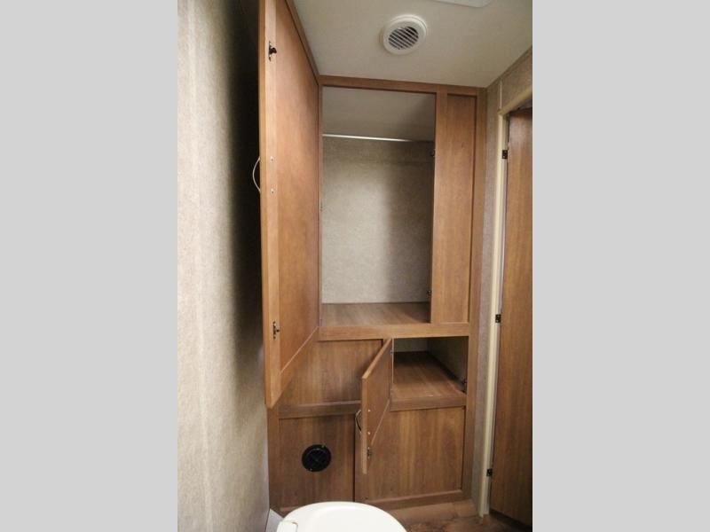 In the very rear of the unit you will love the convenience of your own bathroom while away. Inside find a 34" x 34" shower pan with glass door, a sink, toilet, and a large wardrobe for all of your hanging clothes.