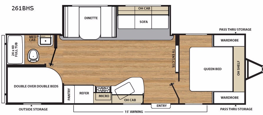 On the outside enjoy a 15' awning, plus outdoor storage beneath the double bed bunks, as well as within the front pass-through storage compartment, and more!