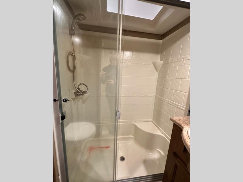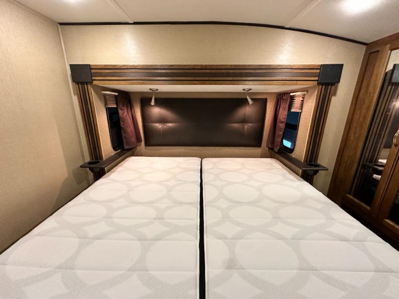 Along the rear wall find an 80" tri-fold sofa with end tables and more storage with cabinets above the entire width of the fifth wheel.