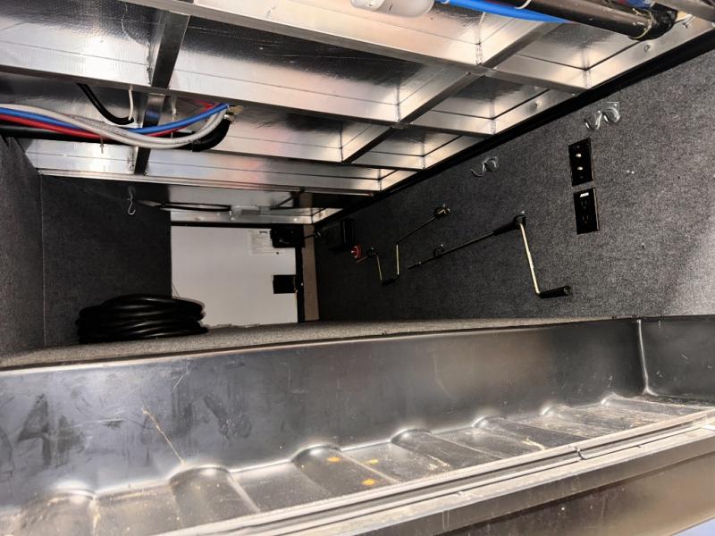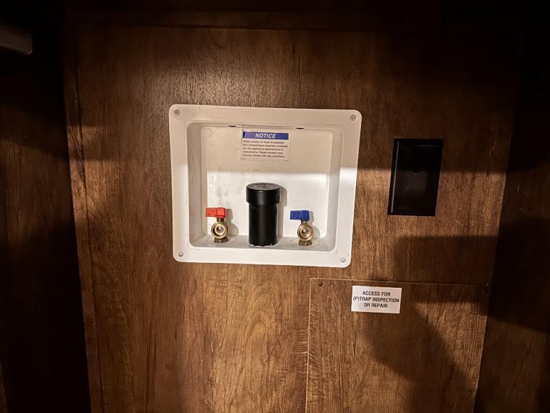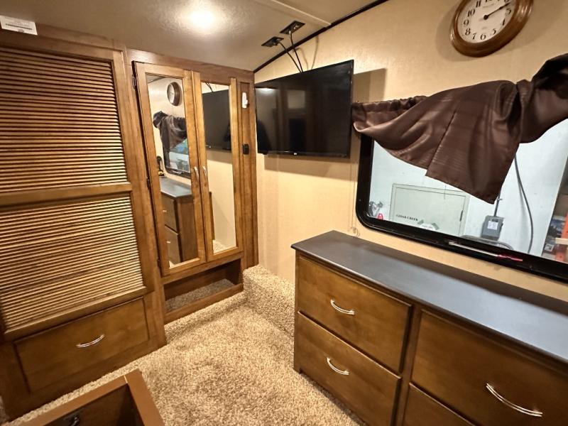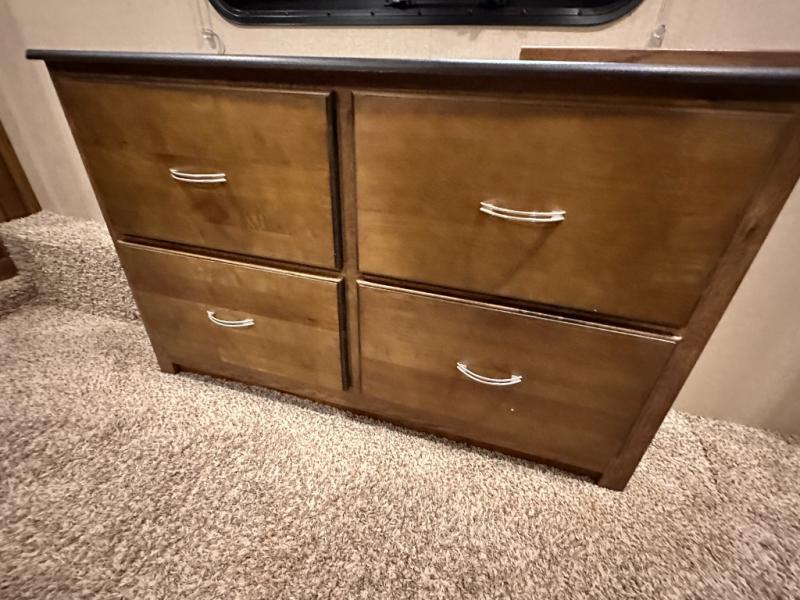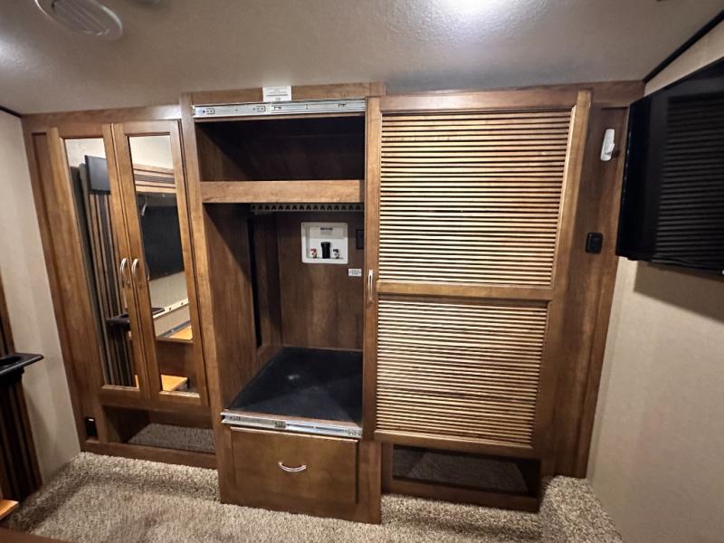 Inside the bedroom through a sliding door find a slide out queen bed or king bed option. There is a dresser opposite the bed along the curb side wall, and a TV bracket so you can mount a flat screen if you choose. There are also dual front wardrobes, one on either side of a washer and dryer prepped space, plus so much more!