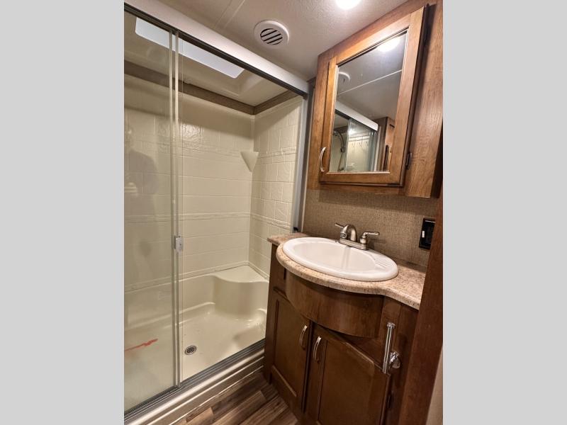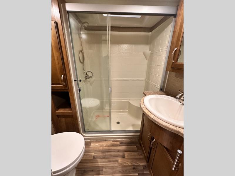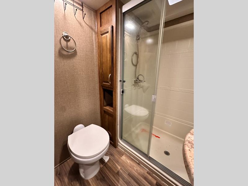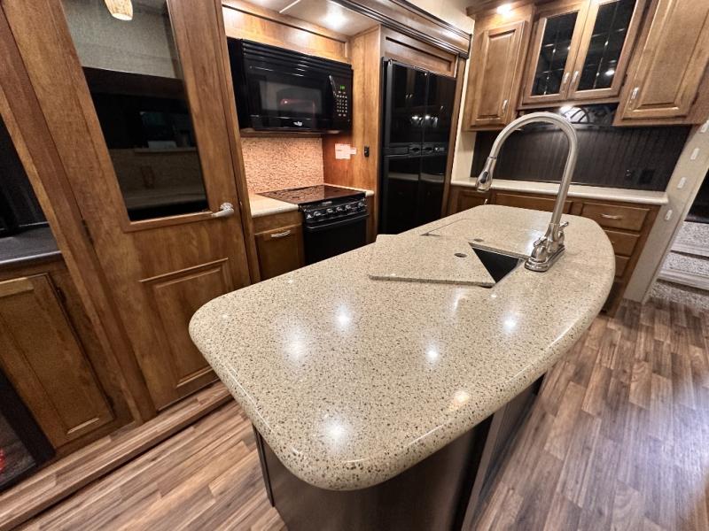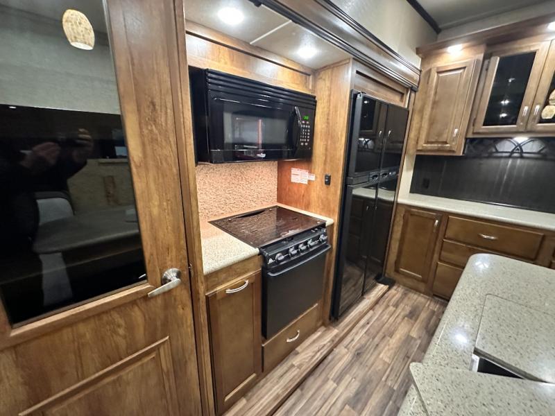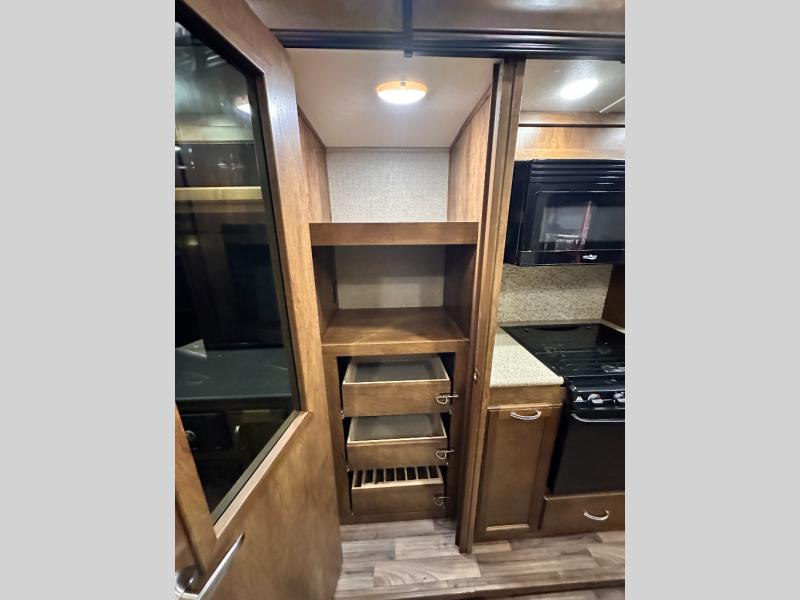 The opposite slide features an entertainment center along with the kitchen appliances within a large slide out. You will love the walk-in residential pantry space, three burner range with overhead microwave, refrigerator, and a second smaller pantry.