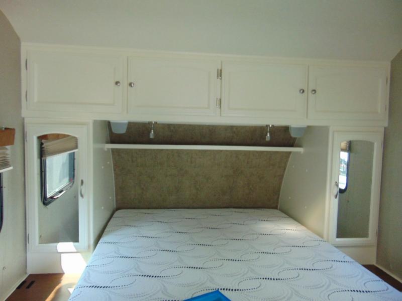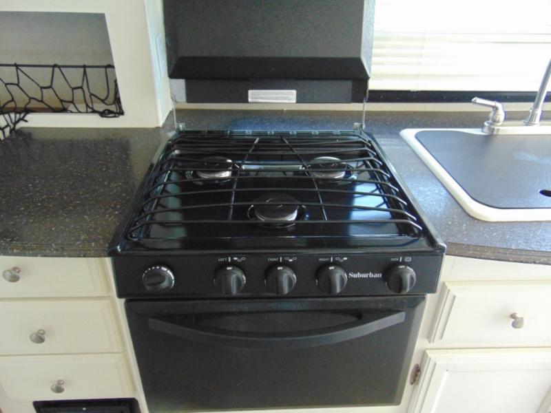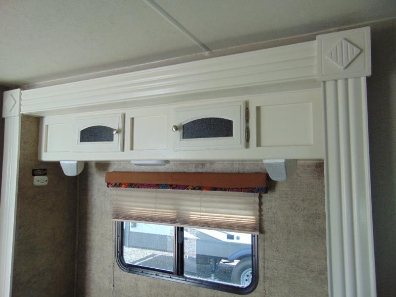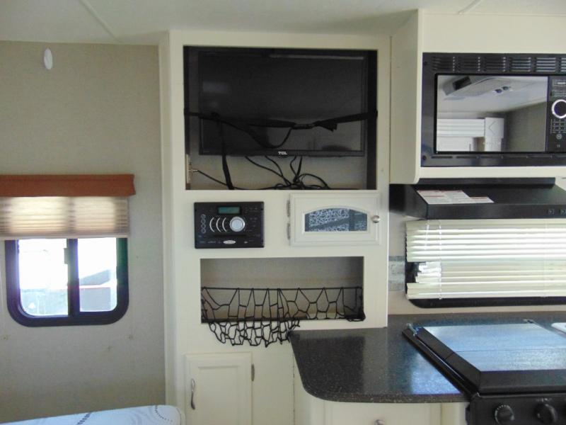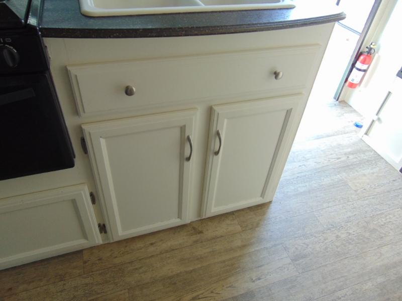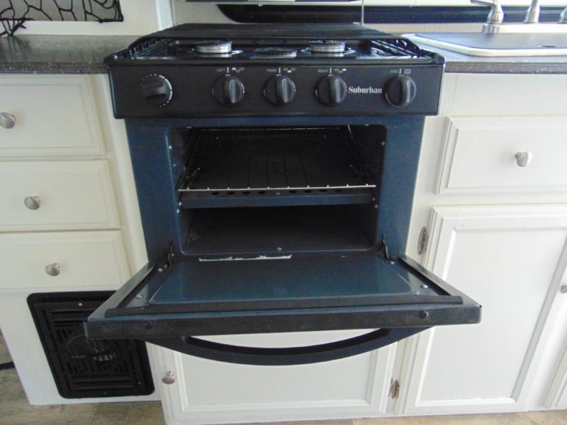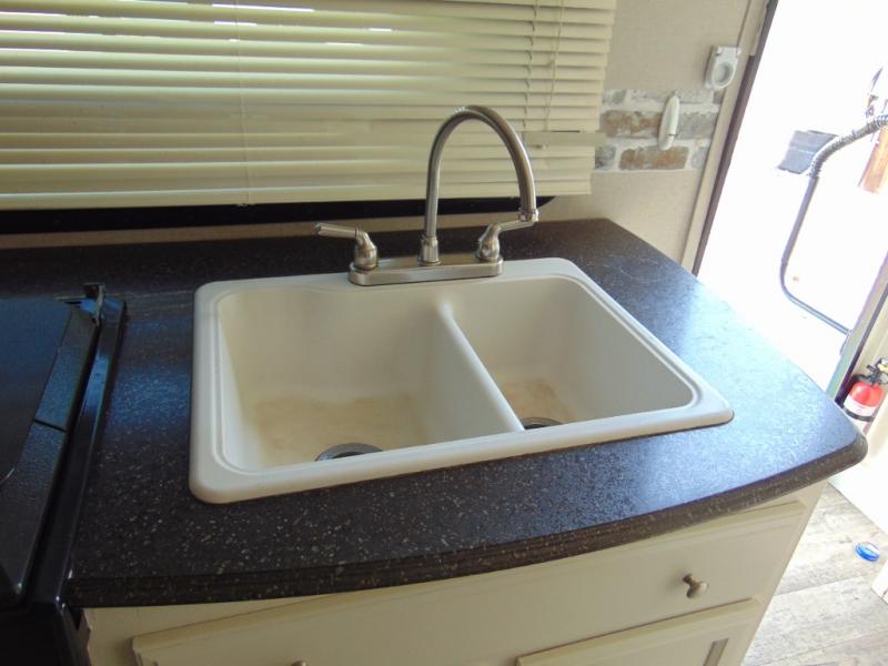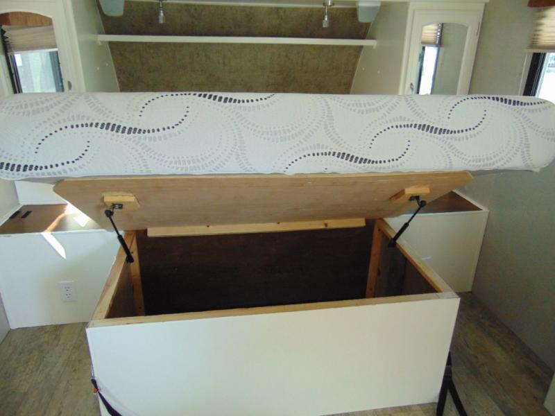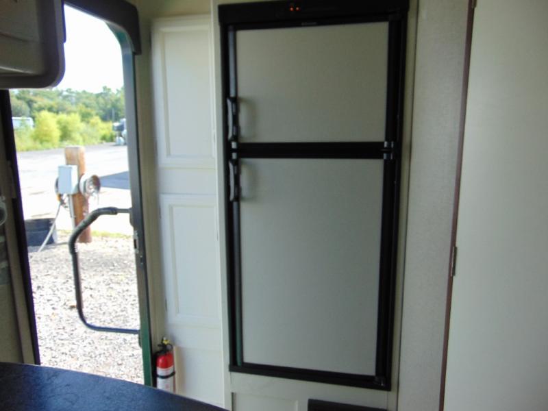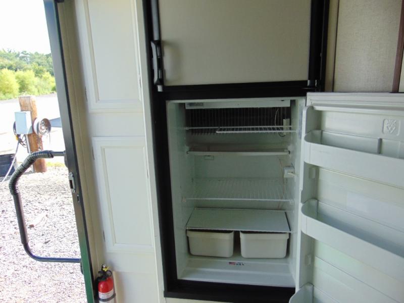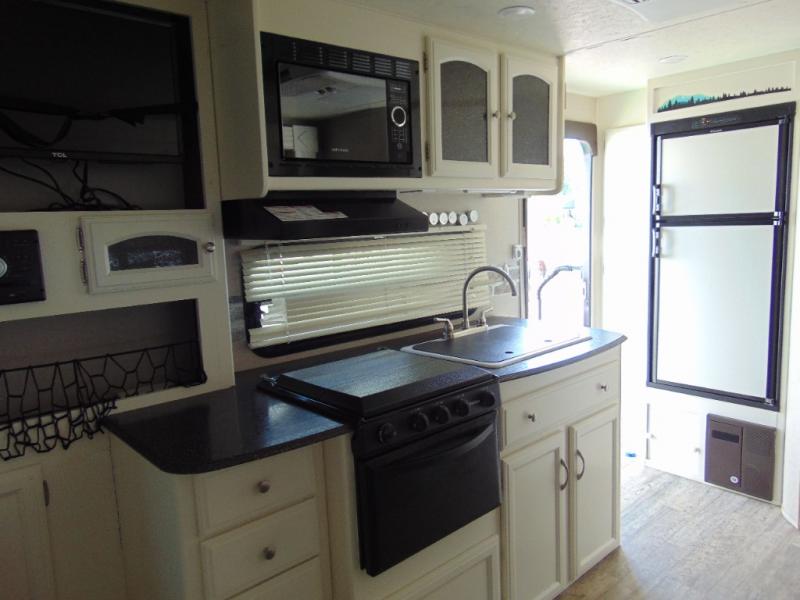 Make all your meals easily inside with a convenient three burner range and microwave oven. There is also a refrigerator to keep your perishables fresh, and a double kitchen sink for cleaning up. You will find that there is plenty of storage throughout in the available overhead cabinets, rear entry hutch, and front pass-through storage compartment outside as well.