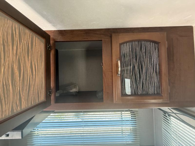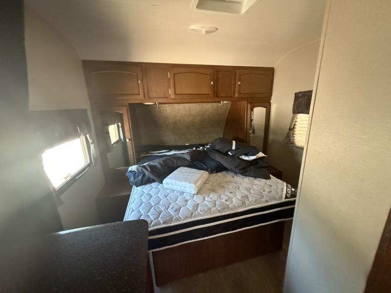 In the front you will see a 60" x 80" queen bed with wardrobes, plus it also features a full overhead storage cabinet too.