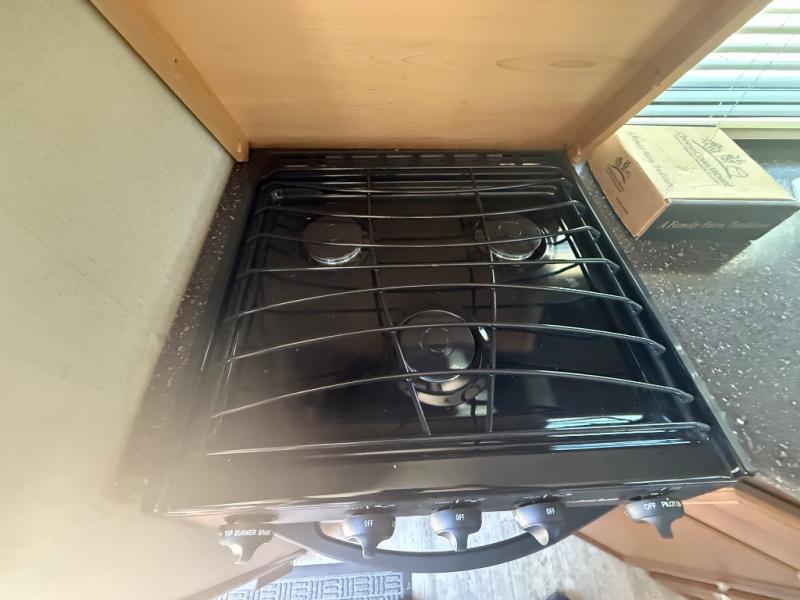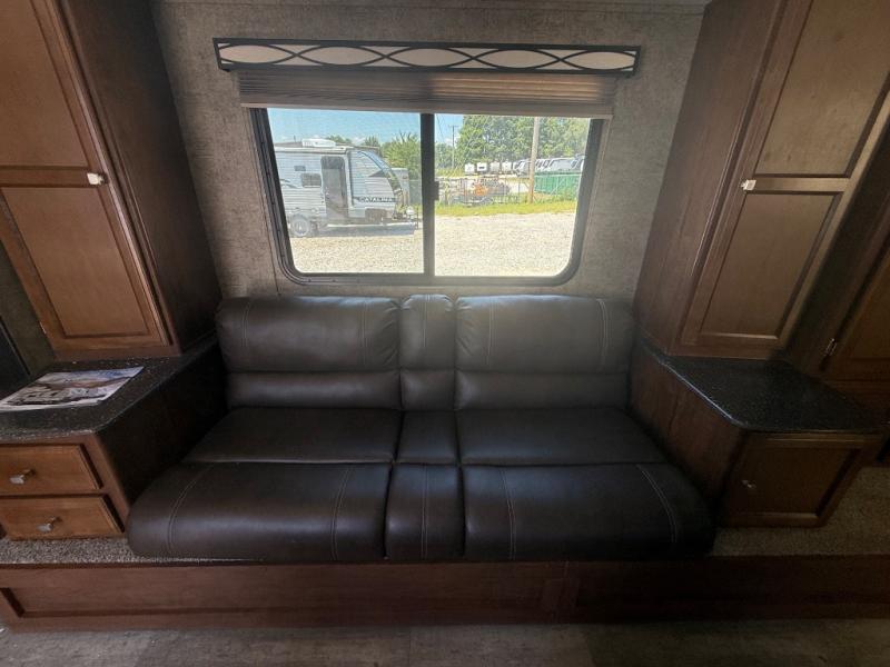 The large slide opens up the living space and features a comfortable sofa with two end tables and also a wardrobe with bench seat. Opposite the slide you will find a booth dinette that also has overhead storage available.. You can choose to add an optional TV here as well.