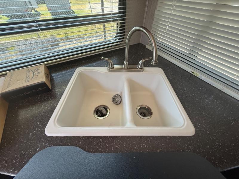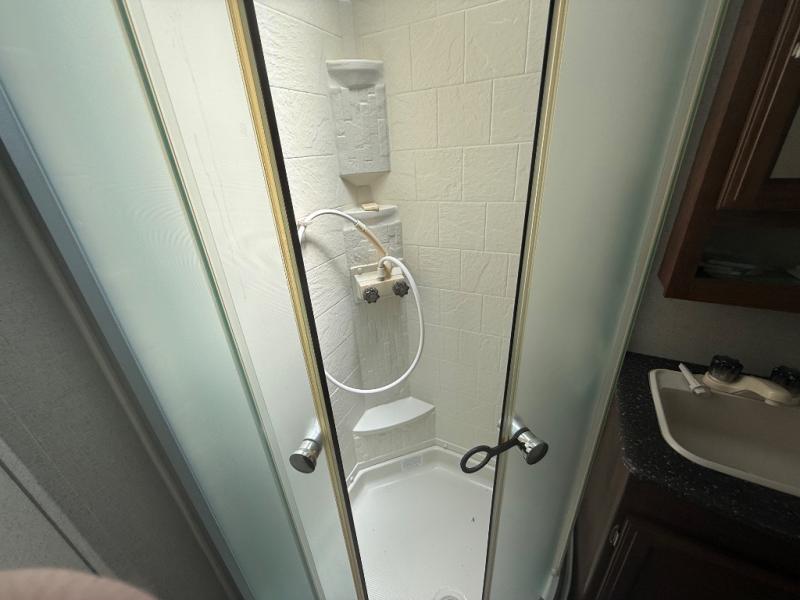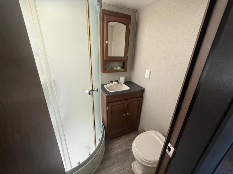 The convenient full bath is located beyond the dinette along the curb side, and features a corner shower, a toilet, and a sink.