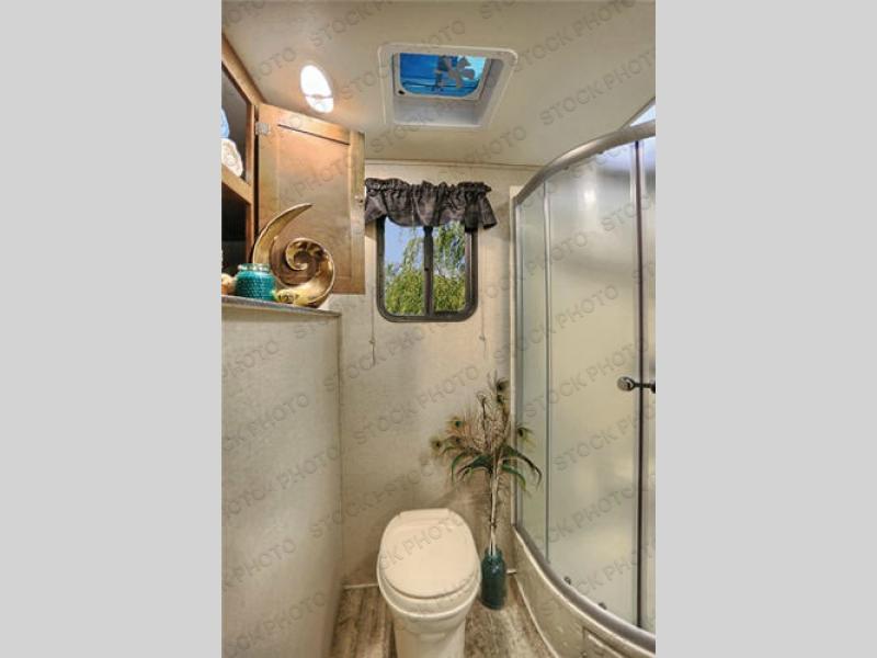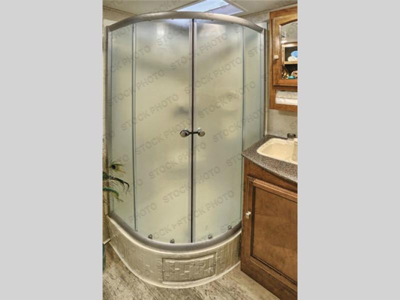 The rear bath features a large linen cabinet, a corner shower, plus sink and toilet. No running to the campground bathroom in the dark here!