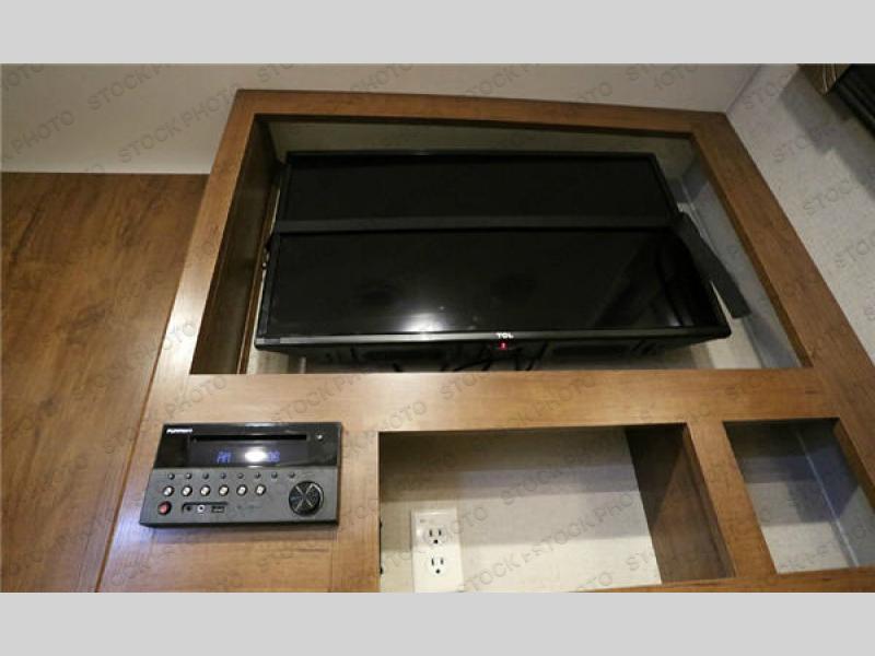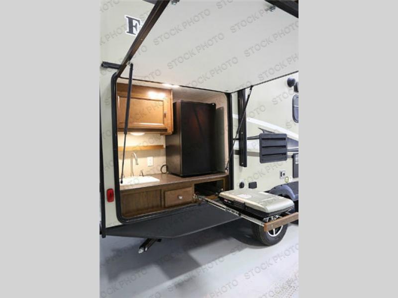 The front exterior pass-through storage compartment features plenty of space for all of your outdoor camping gear. You will also enjoy the convenience of a rear camp kitchen below the bath linen cabinet which is a great feature for those who enjoy cooking and dining outside.
