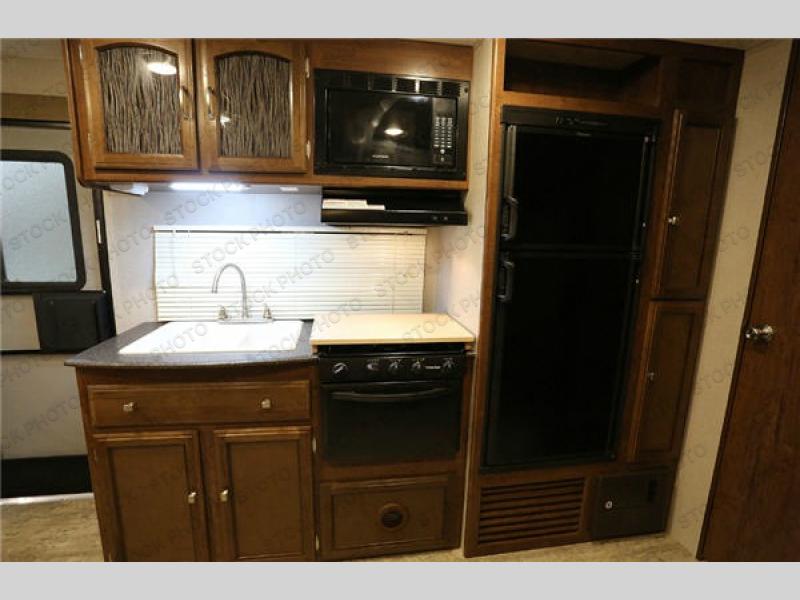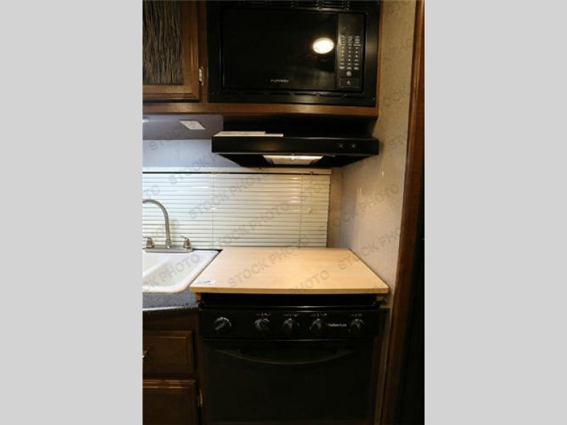 Head back to the center kitchen area with large slide out 88" wide u-shaped dinette. The dinette can also be used as additional sleeping space with the table folded down. Across the room to the left of the entrance you will find the kitchen area that features a pantry, a refrigerator, and a three burner range with an overhead microwave oven. There is also a handy double sink for cleaning up.