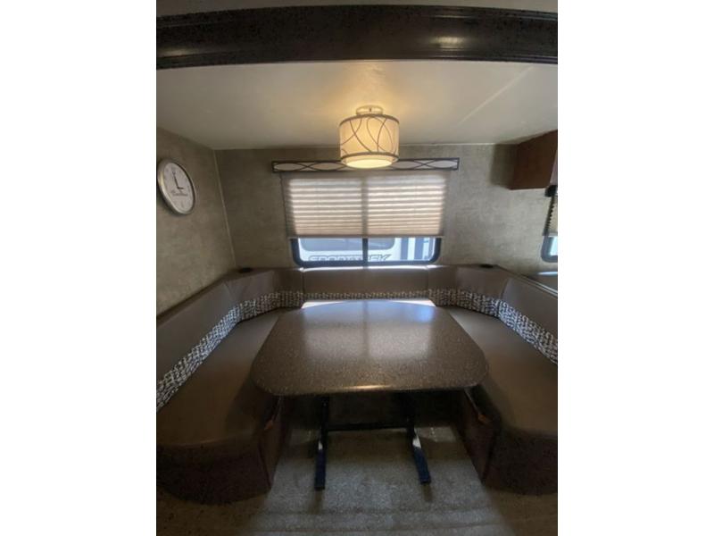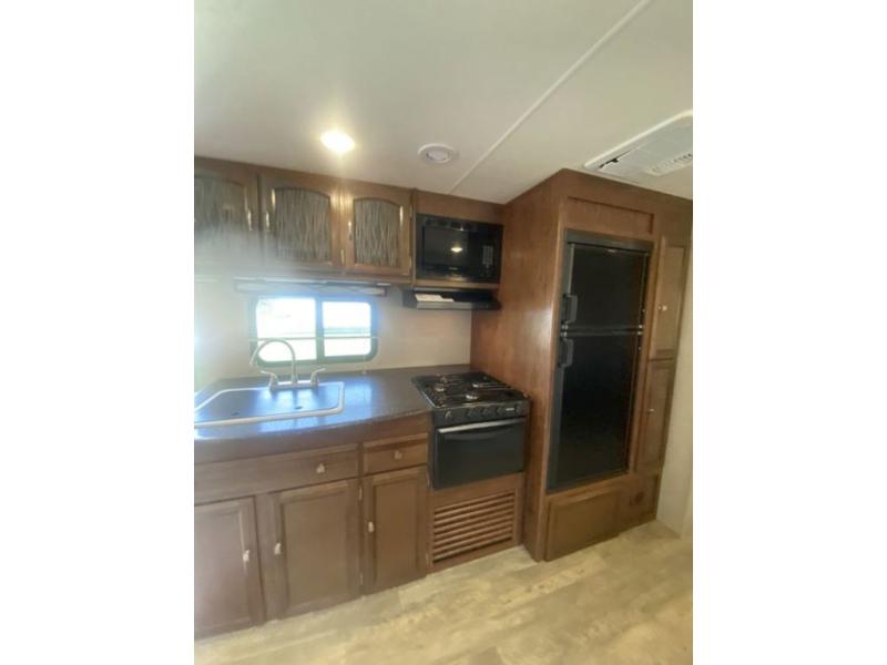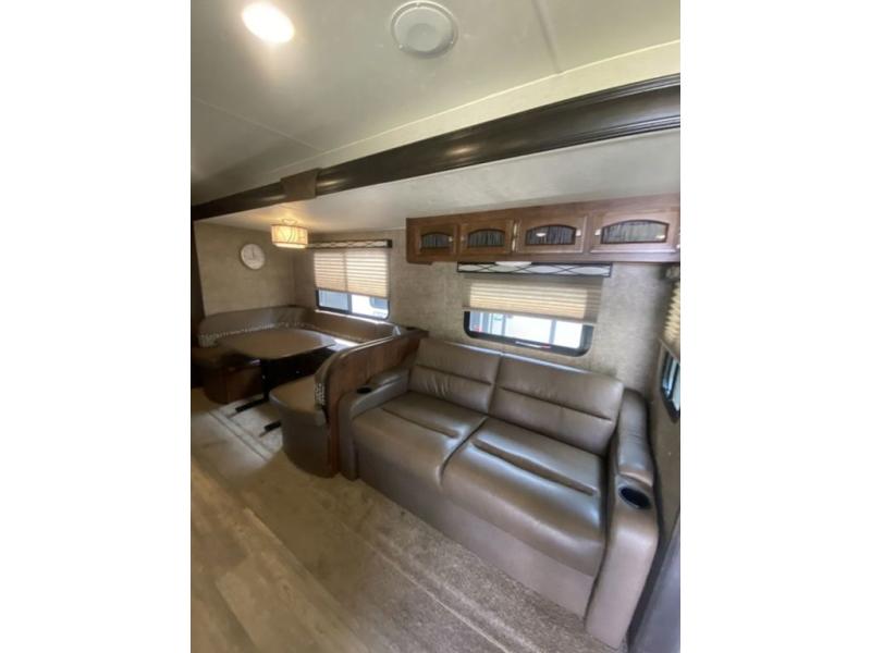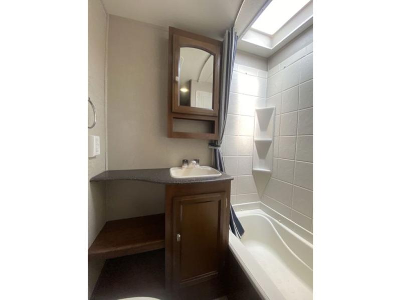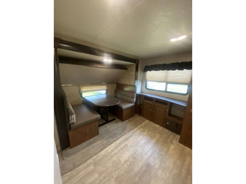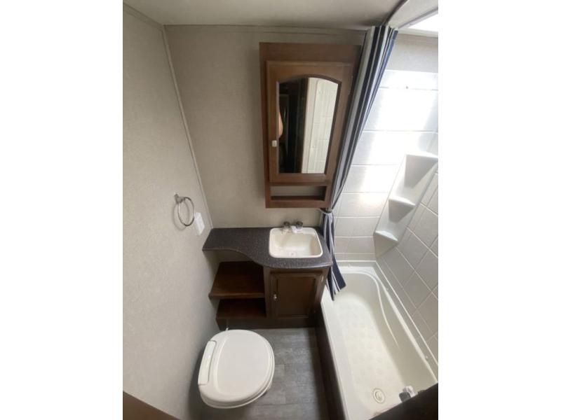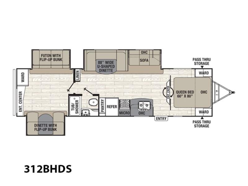 The main living area features a combined kitchen and living room complete with slide out u-dinette and sofa which includes an overhead storage cabinet. There is also a centrally located bath complete with toilet, sink and tub/shower. You will also find plenty of storage throughout the unit in overhead cabinets, in the linen cabinet just outside the bunk room door, and also in the pantry provided next to the refrigerator.