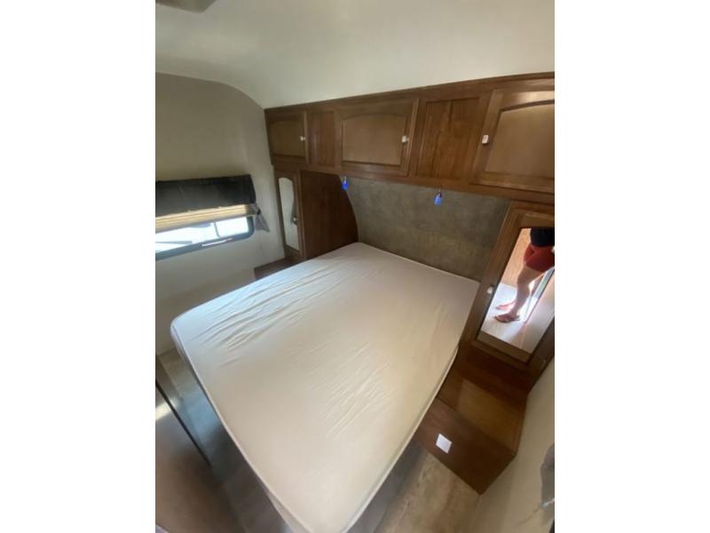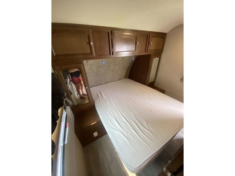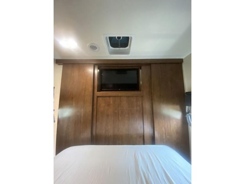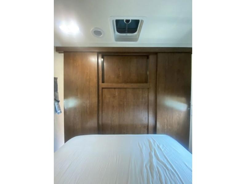 The main bedroom up front features a 60" x 80" queen size bed with a wardrobe on either side of the bed for your clothing. There is also a front pass-thru storage compartment for extra gear, and so much more.