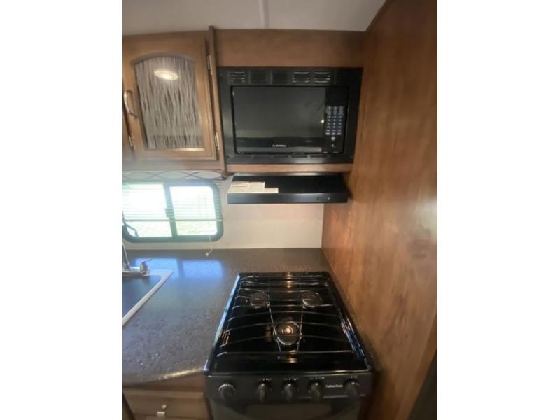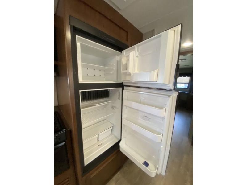 You will enjoy cooking in this Freedom Express kitchen with full amenities including a three burner range with overhead microwave oven, a refrigerator, and a double kitchen sink that is perfect for cleaning up. There is also an entertainment center with swivel TV box in the living room that separates the living area from the front bedroom. The swivel box allows for multiple position viewing.
