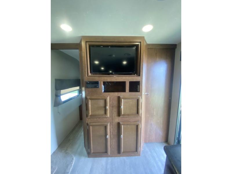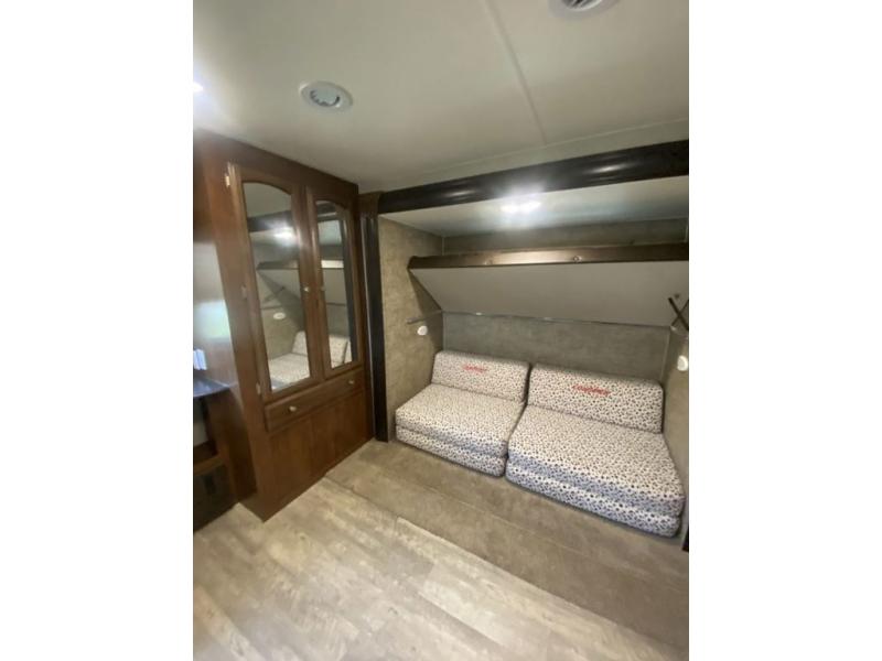 Check out the private rear bunkhouse featuring dual opposing slide outs. The road side features a slide out futon with flip up bunk above. Opposite along the curb side find a dinette with flip up bunk above creating daytime seating and sleeping space for several campers. The bunkhouse entertainment center provides an added place for kids or extra guest to have a separate space to hang out and watch their favorite TV. There is also a wardrobe for storage.