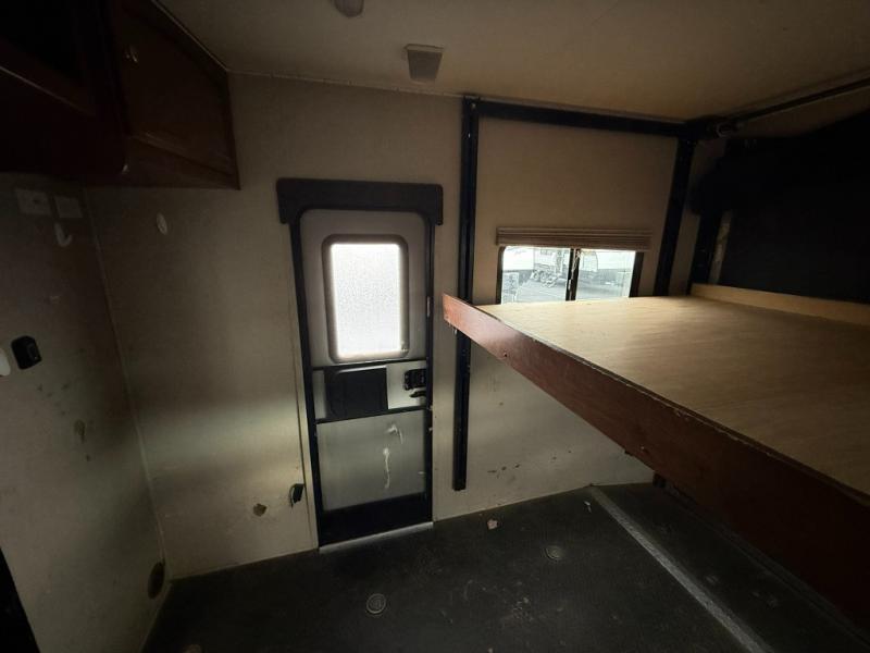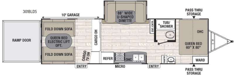 Inside the cargo area you will find plenty of overhead cabinetry for storage plus a TV overhead cabinet as well. There are two fold down sofas with a removable table between, plus an optional electric lift queen bed above. There is also a convenient cargo side entry door.