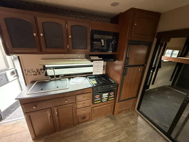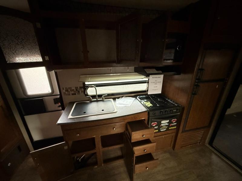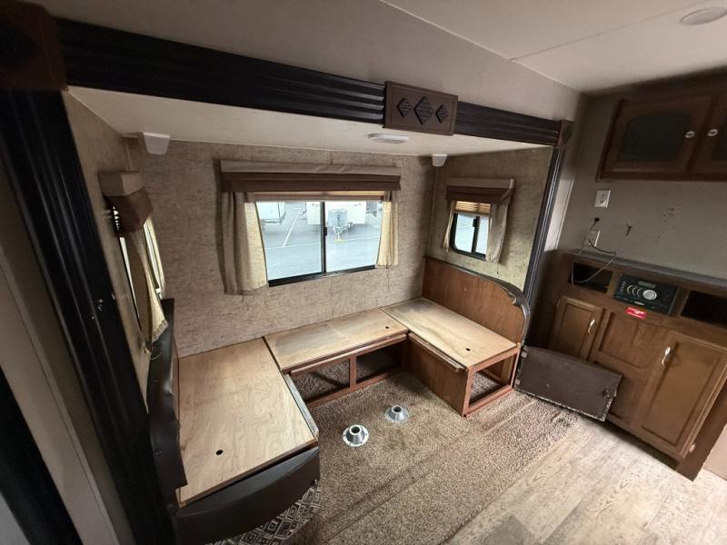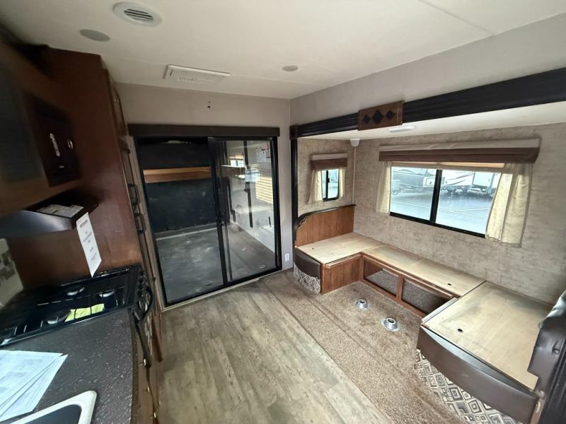 Step inside the main living area which features a large u-shaped dinette slide. Directly across the room is the complete kitchen featuring a refrigerator, three burner range with microwave, and a double kitchen sink. There is also an entertainment center next to the slide that can be viewed easily from the dinette.
