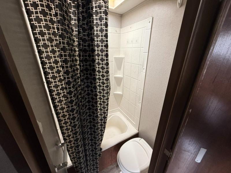 Up front there is a comfortable queen bed with overhead storage cabinet and side wardrobe. The bath is nearby with a private toilet and tub/shower area with a separate sink just outside the bath door.