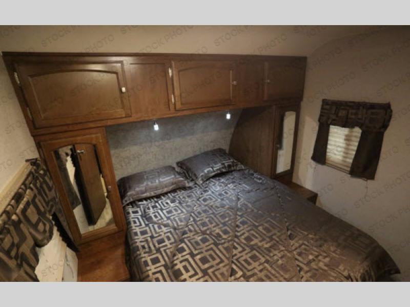 The private front bedroom features a comfy queen bed with nightstands and wardrobes on either side of the bed, plus overhead storage.
