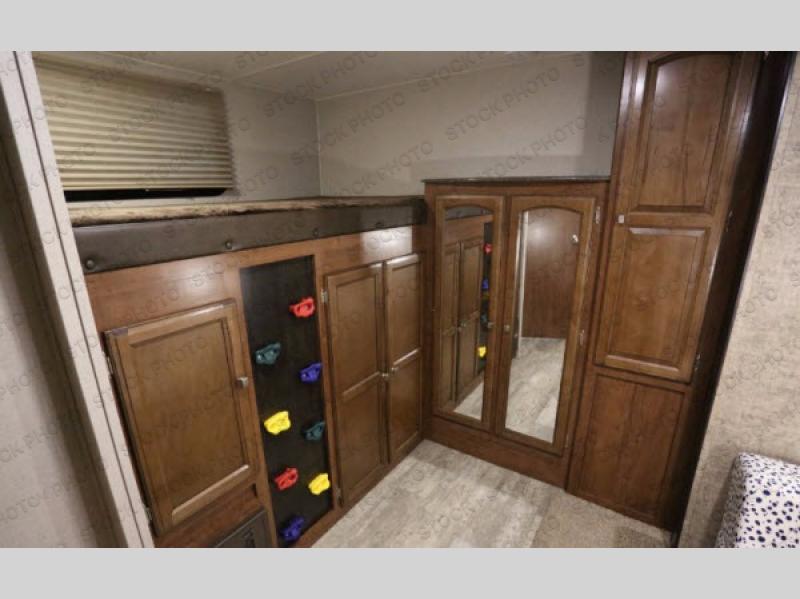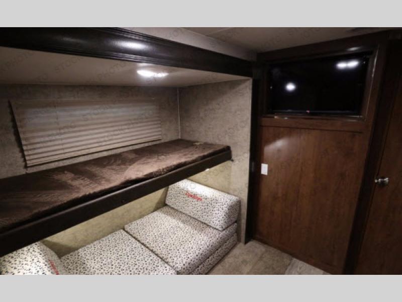 In the rear of the trailer there is a large bunkhouse that features a double bunk, wardrobe, plus a 2nd wardrobe/TV combo along the rear. There is also a futon slide with a flip-up bunk that can be conveniently tucked away during the day when you want more seating.