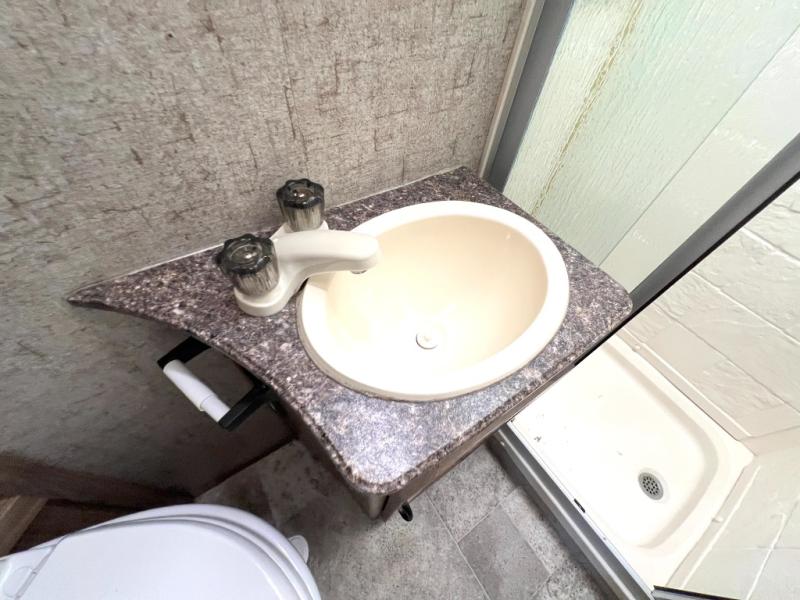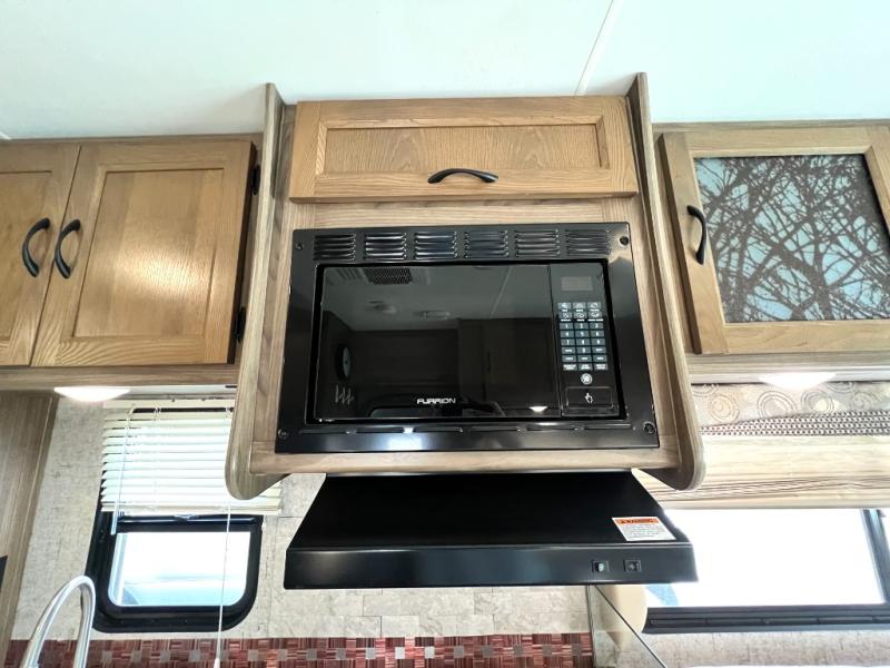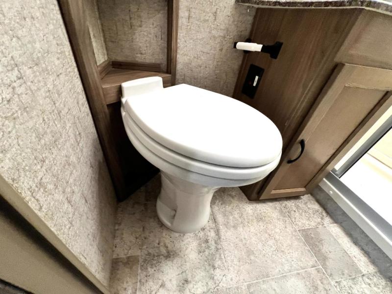 Step inside and see a J-lounge with 18" extension, a table, and overhead cabinets to the right of the entrance. To the left of the entrance there is a refrigerator for your perishables. Across from the J-lounge you can sit and relax on the sofa. Above the sofa you will find an overhead cabinet where you can store blankets or games. Next to the sofa there is a double kitchen sink, three burner range, microwave, and a pantry for your dry goods.