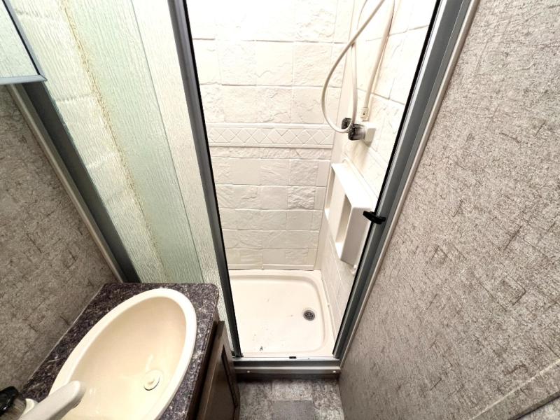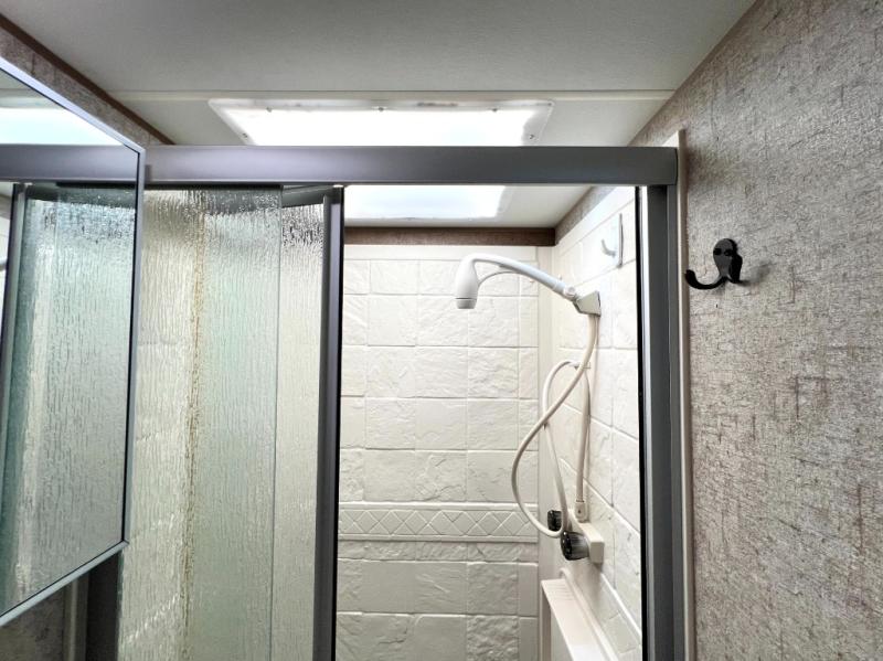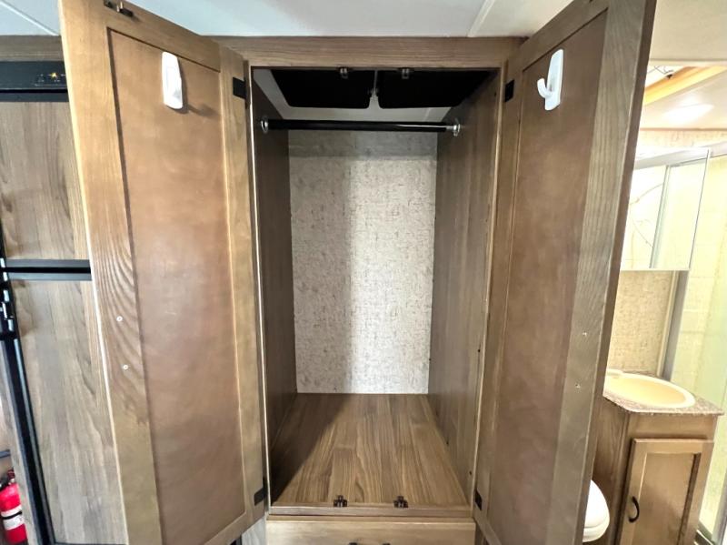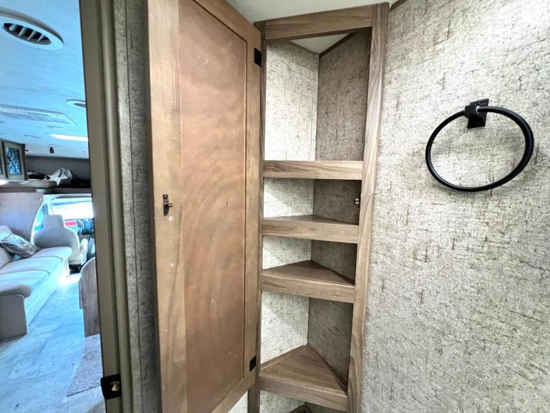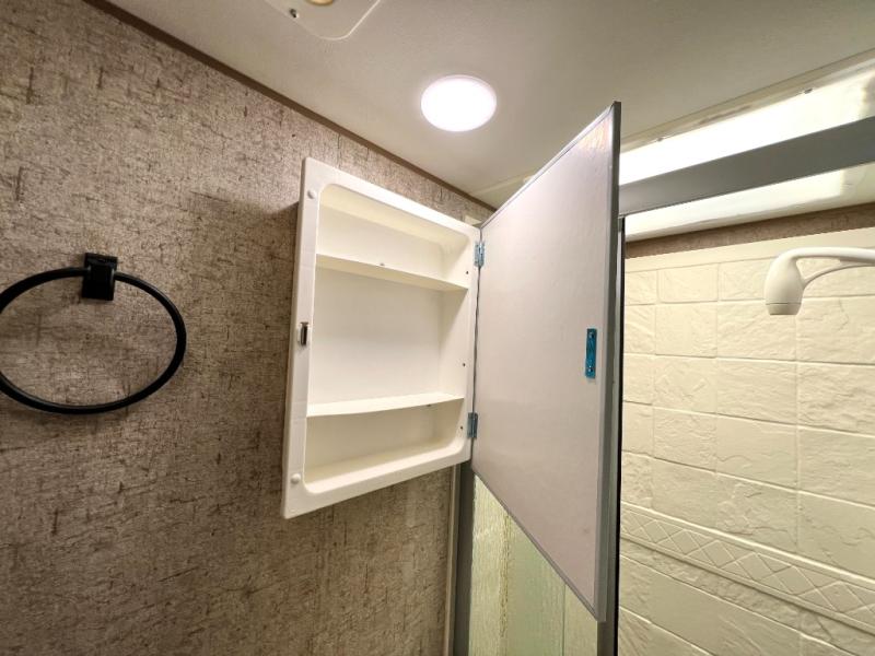 In the rear left corner of this Freelander 26RS is a bathroom with a toilet, sink, linen cabinet, and shower. Next to the bathroom there is a wardrobe for hanging your clothes. The bedroom is also in the rear of the motor home. There is a queen bed slide with a nightstand, plus so much more inside this coach!