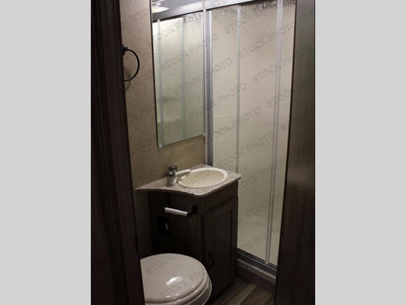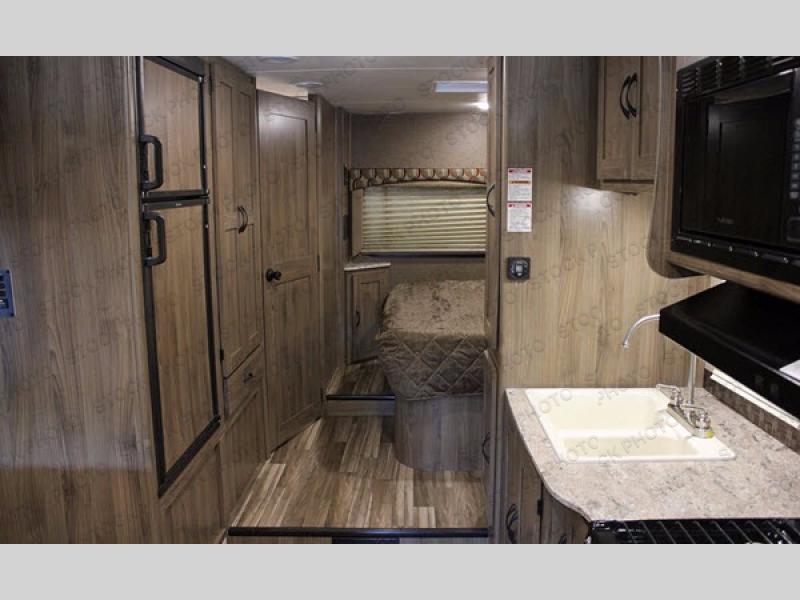 Step inside and see a J-lounge with 18" extension, a table, and overhead cabinets to the right of the entrance. To the left of the entrance there is a refrigerator for your perishables. Across from the J-lounge you can sit and relax on the sofa. Above the sofa you will find an overhead cabinet where you can store blankets or games. Next to the sofa there is a double kitchen sink, three burner range, microwave, and a pantry for your dry goods.