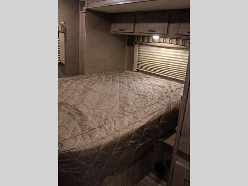 In the rear left corner of this Freelander 26RS is a bathroom with a toilet, sink, linen cabinet, and shower. Next to the bathroom there is a wardrobe for hanging your clothes. The bedroom is also in the rear of the motor home. There is a queen bed slide with a nightstand, plus so much more inside this coach!