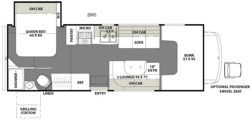 Over the cab area enjoy a 57" x 95" bunk when it is time to turn in for the night. You may choose an optional passenger swivel seat for additional seating in the living area.