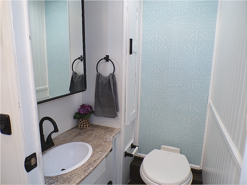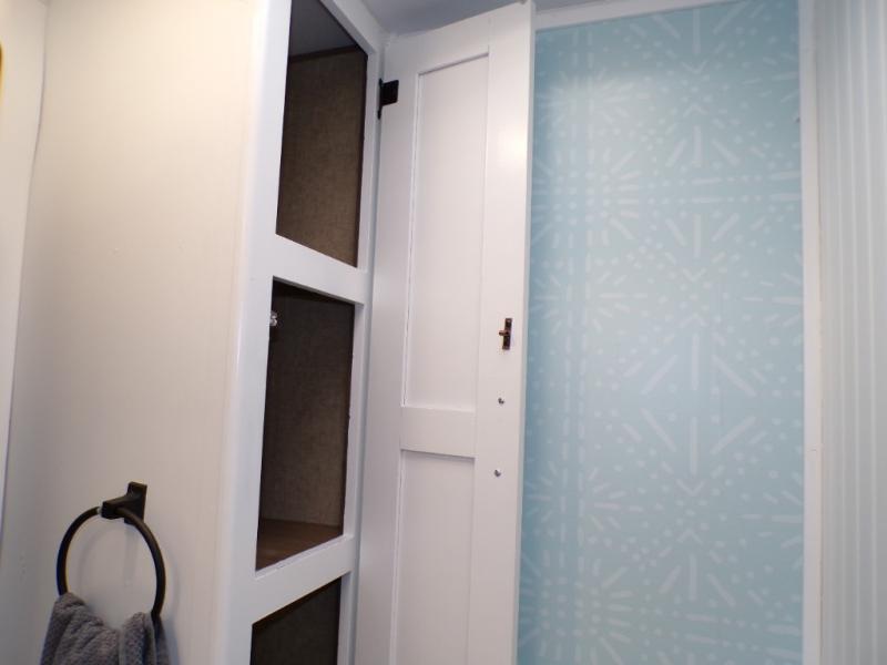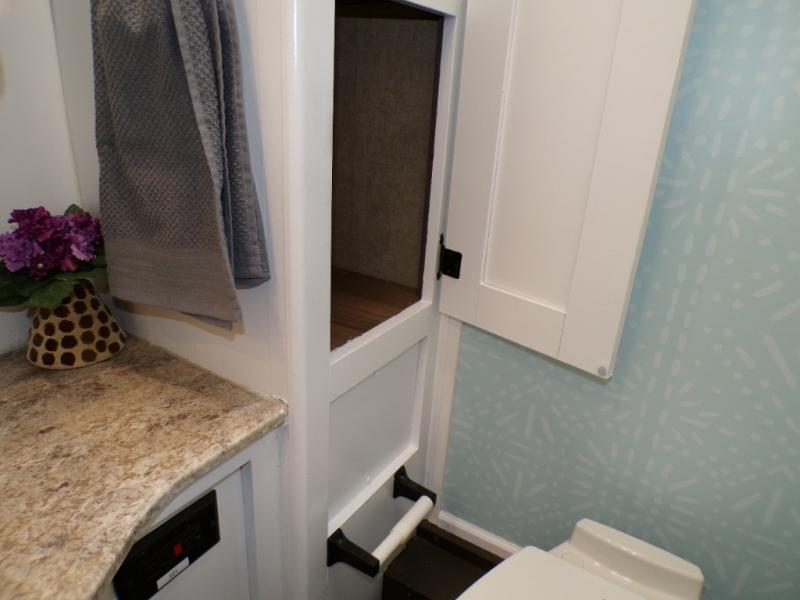 There is a split bath including a private toilet area with vanity and sink plus linen cabinet along the curb side wall. The shower is directly opposite.