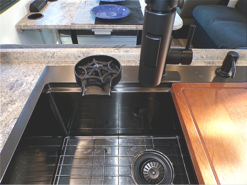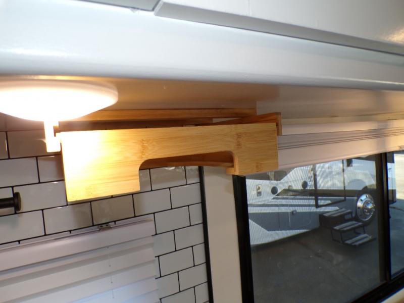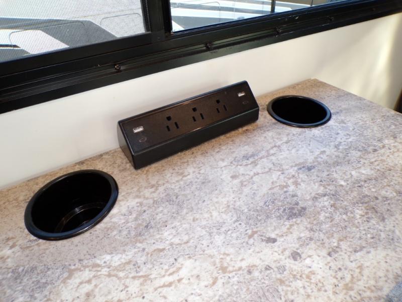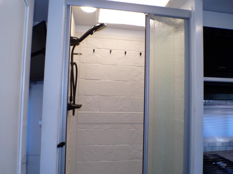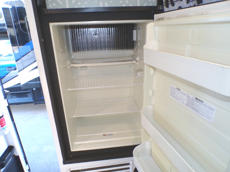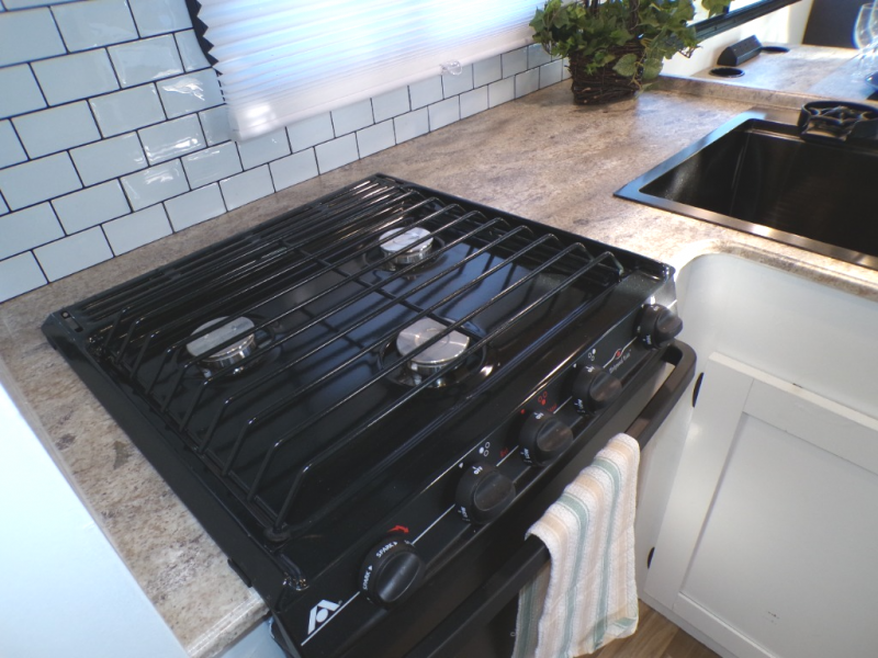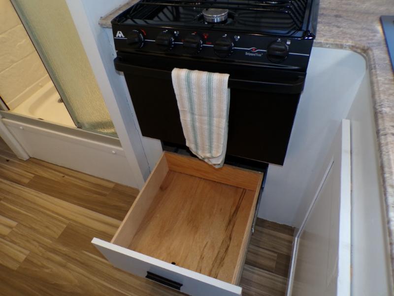 To the left of the side entry door find the refrigerator, and across from that is the rest of the kitchen amenities including a double sink, a three burner range, overhead microwave, and counter top extension. You will also find plenty of storage space for your dishes and things as well.