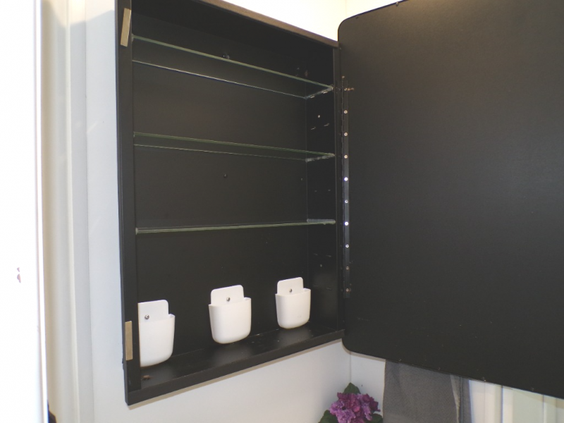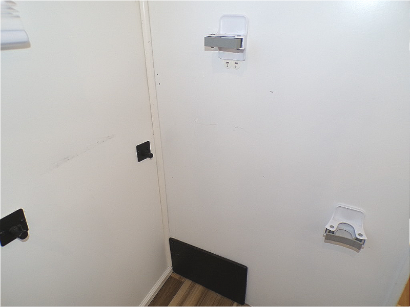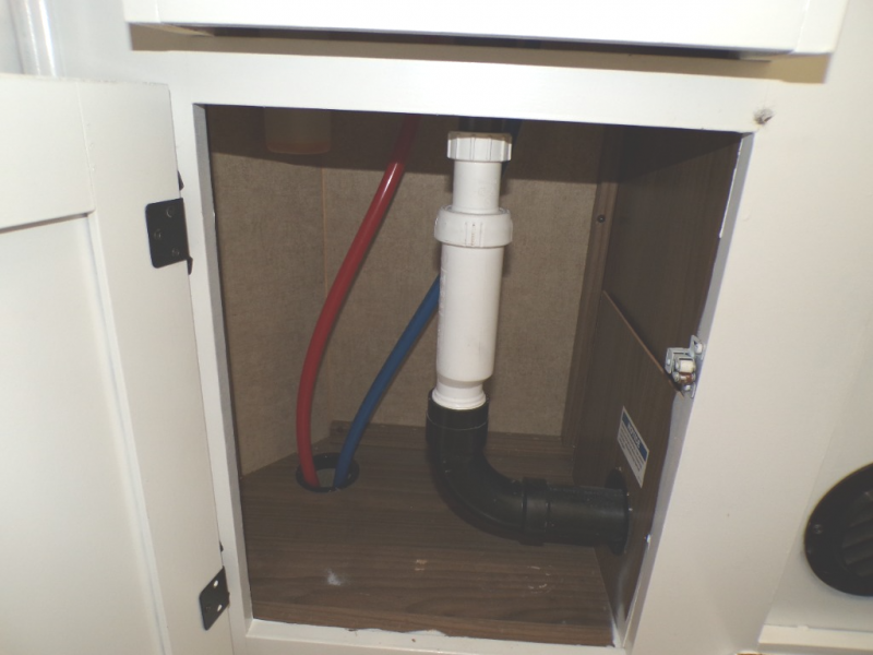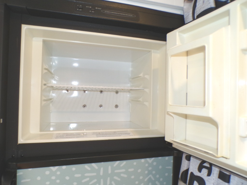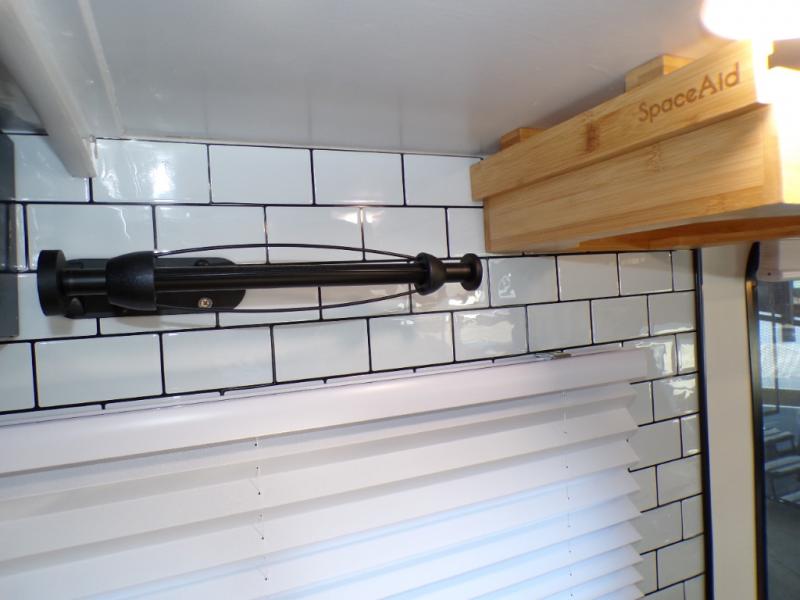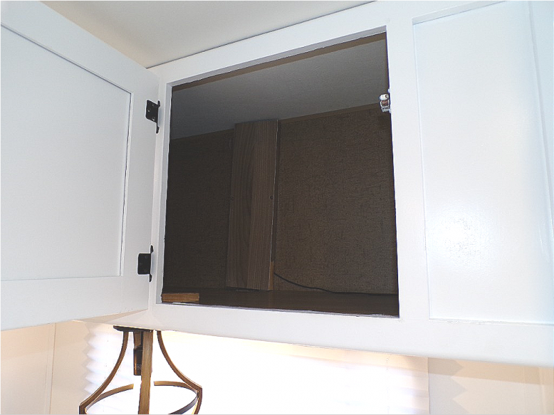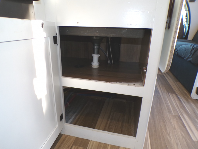 To the left of the side entry door find the refrigerator, and across from that is the rest of the kitchen amenities including a double sink, a three burner range, overhead microwave, and counter top extension. You will also find plenty of storage space for your dishes and things as well.