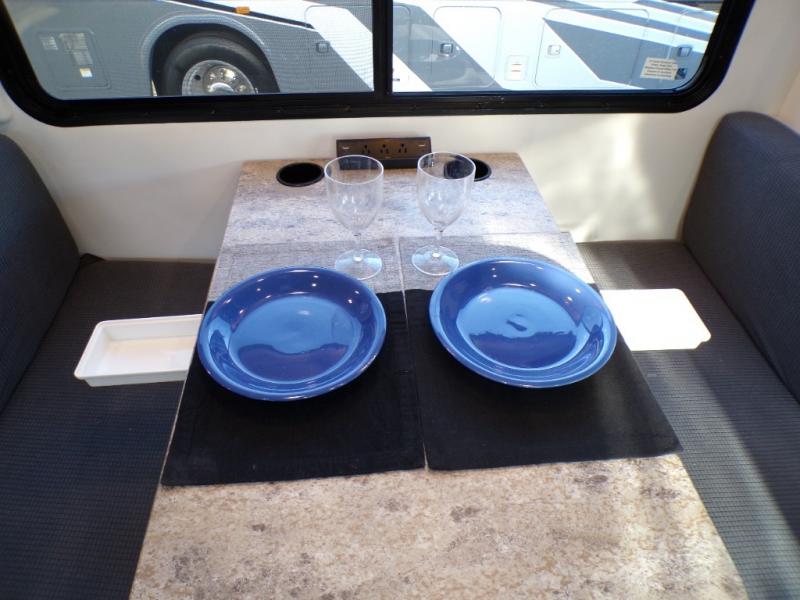 Model 27QB has a side entry door that leads right into the main living space where you will find a sofa on your right opposite a 42" x 71" booth dinette, both with overhead storage.