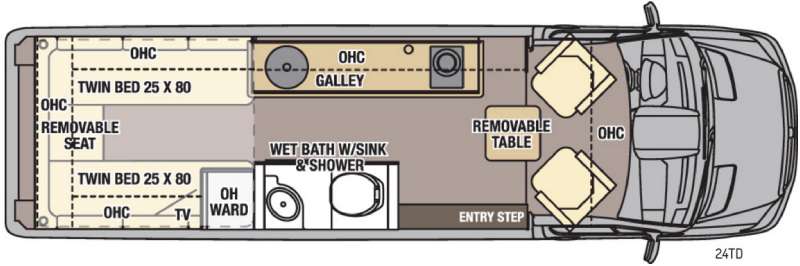 Luxurious travel is possible in this Coachmen Galleria class B diesel coach. Model 24TD offers a very livable floorplan layout with a set of twin beds in the rear, and all of the amenities to make this a truly versatile traveling vehicle.