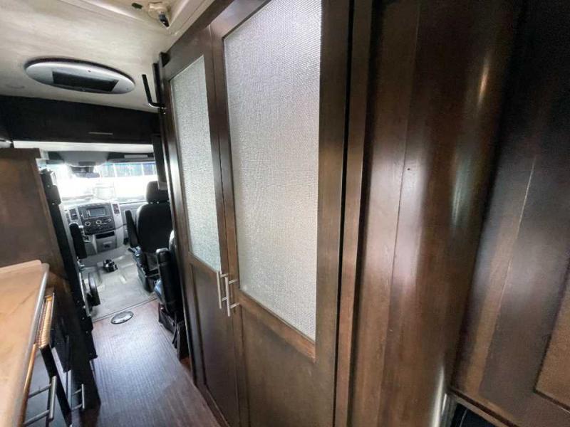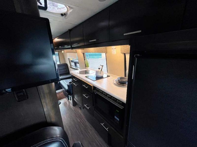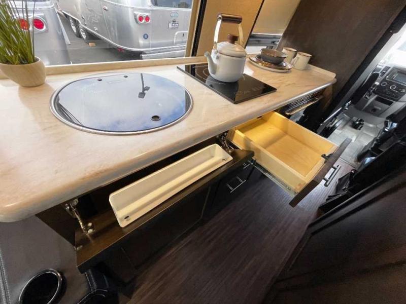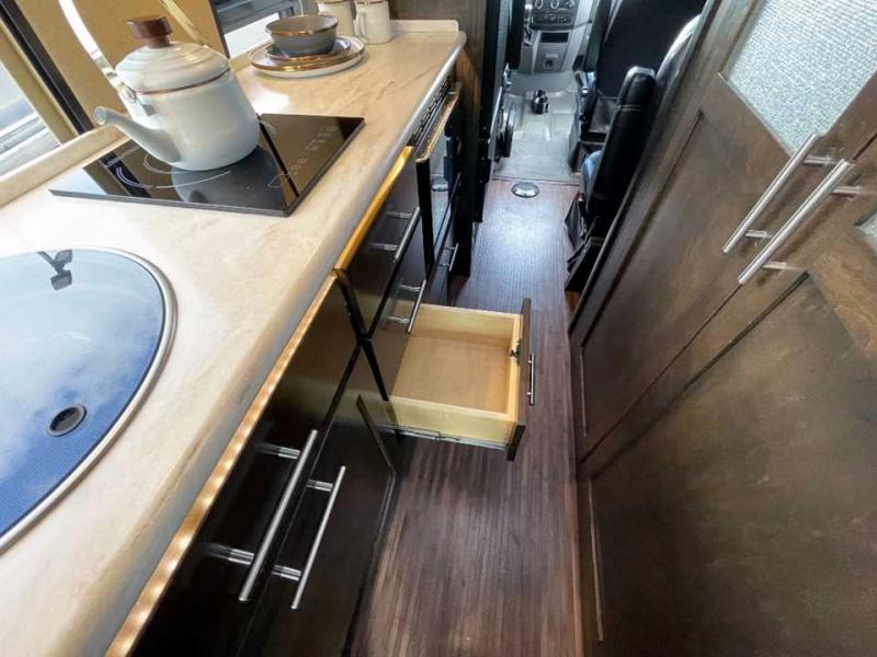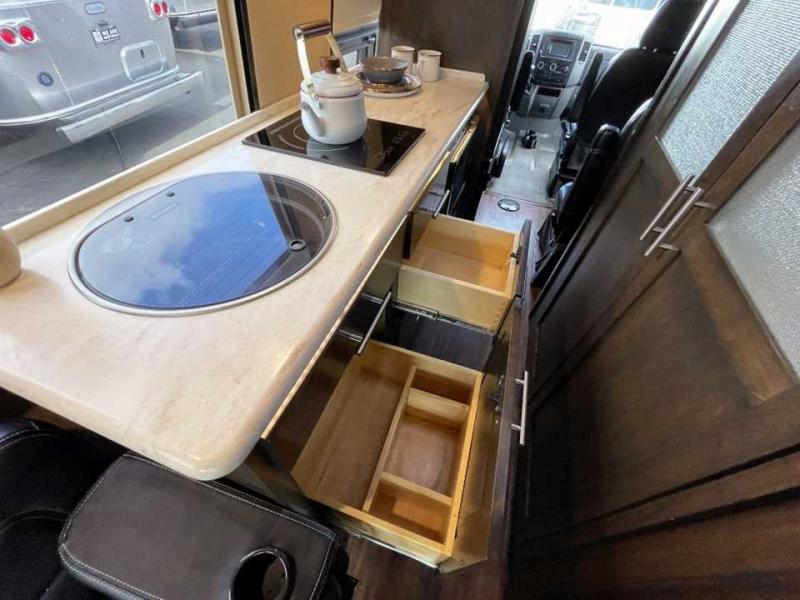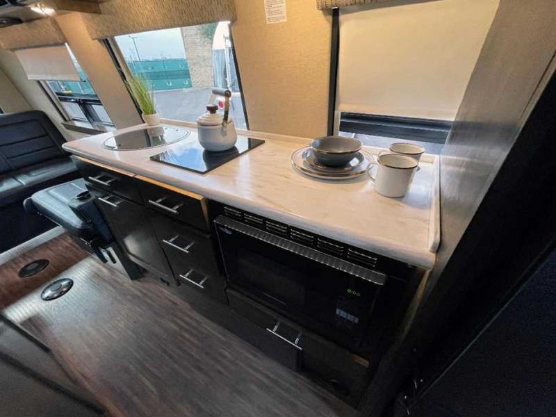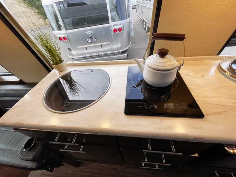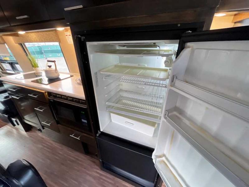Mid coach you will find the best conveniences for when you are traveling away from home. You can easily get refreshed each day with a curbside wet bath including a shower, toilet and sink. Plus a road side kitchenette to easily cook up light meals and snacks when you stop for awhile. Use the round sink surrounded by a Corian countertop for food prep and cleaning up, plus there is also a induction one burner cook-top, and convection microwave oven. You can also keep your perishables cold and fresh in the refrigerator provided.