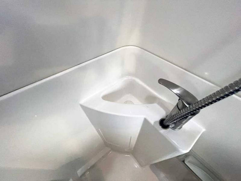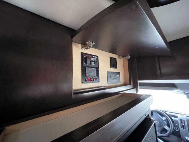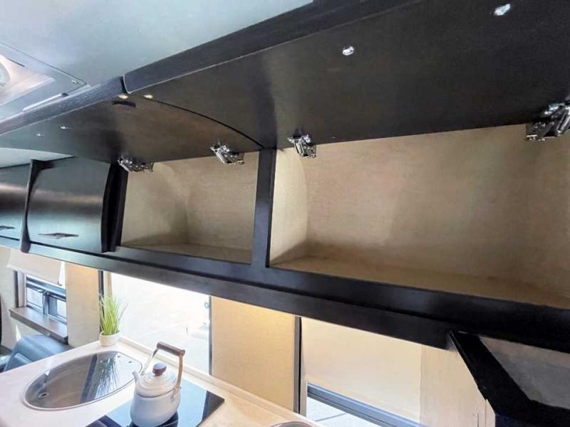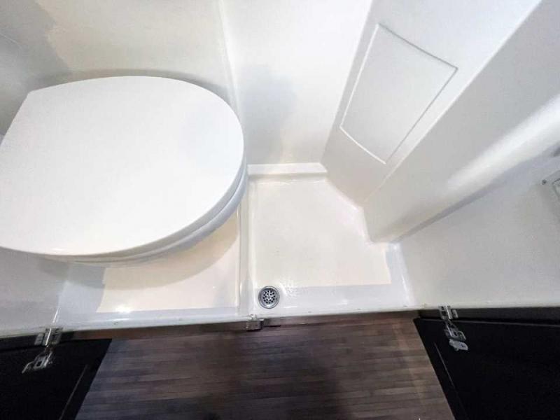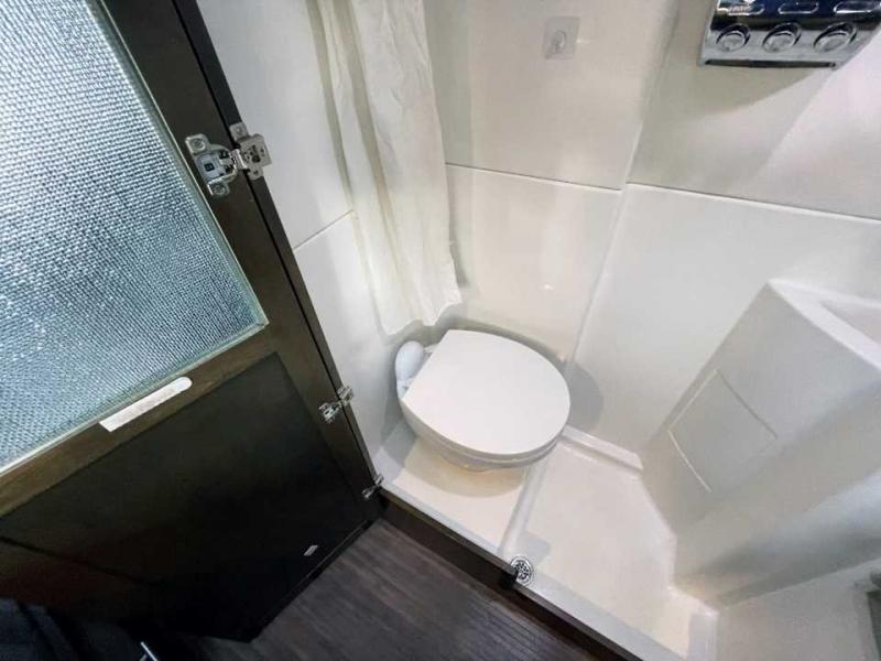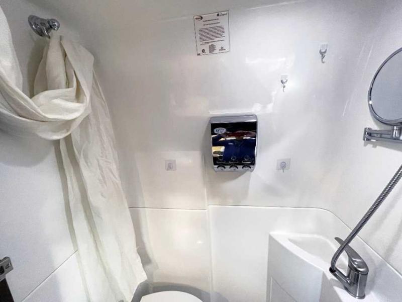 Step inside and swivel the front captain's chairs around to face the back with a removable table in the center which is great for coffee or meals. There is overhead storage above the cab area so you can keep things neatly tucked away, as well as a 22" LG TV for enjoyment while stopped.