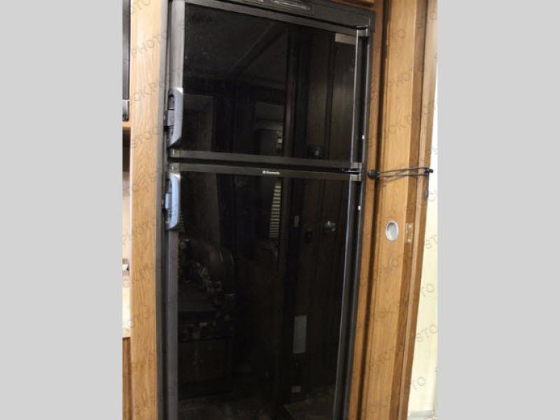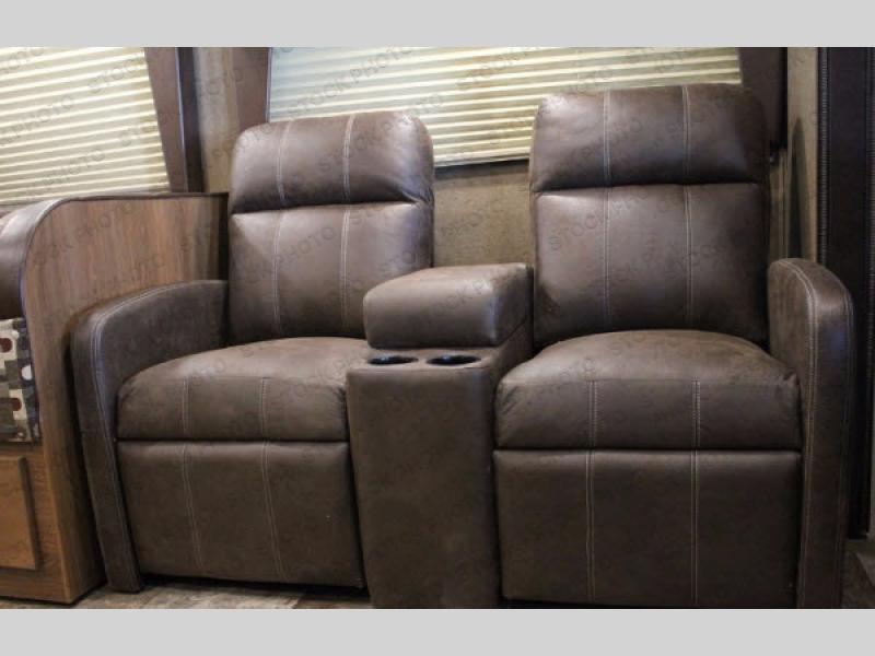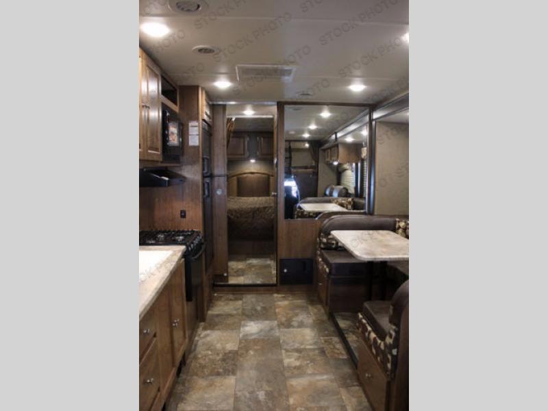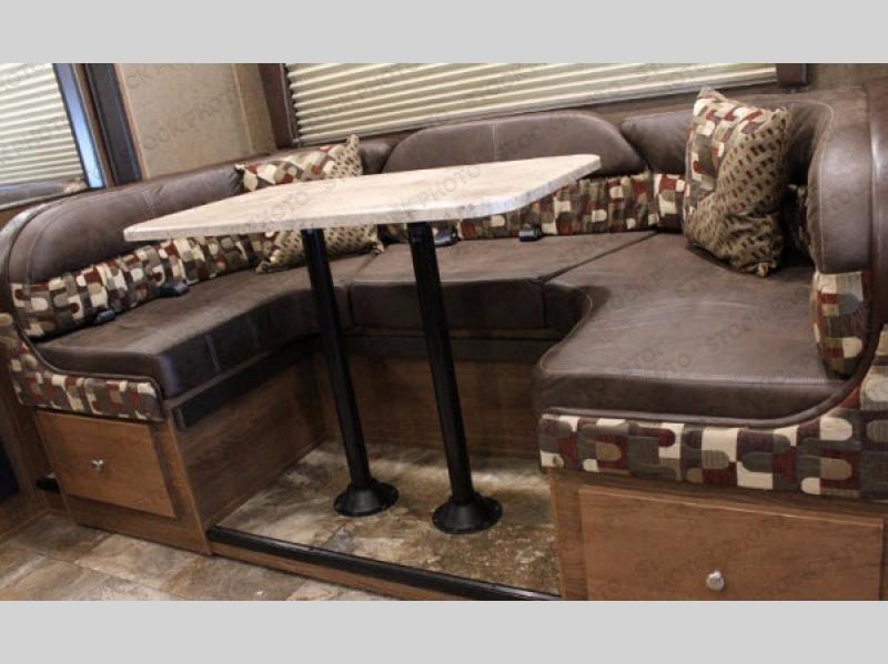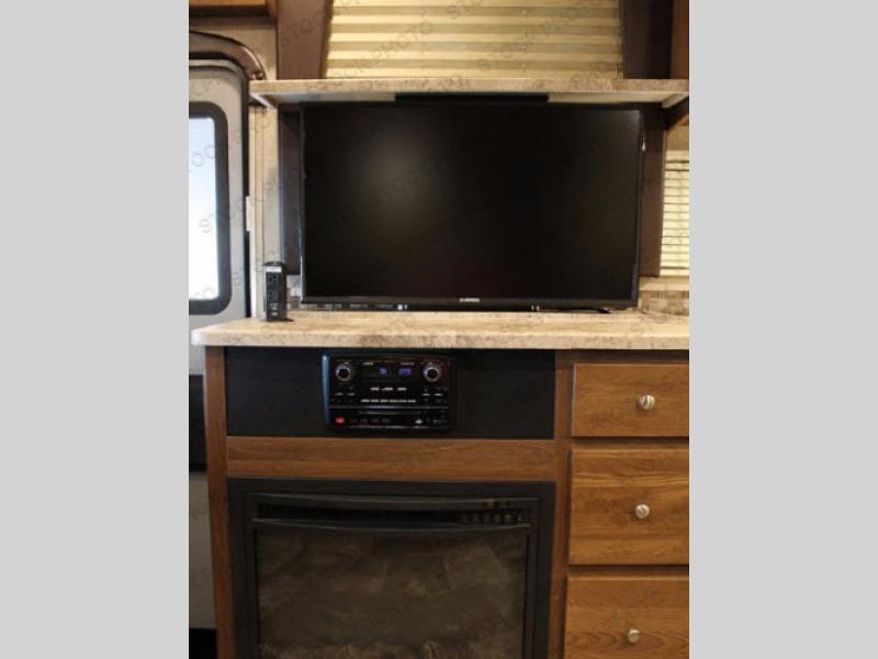 Straight in the entry door find a sofa and u-shaped dinette slide out including cabinets for storage above the sofa. You may choose the optional recliners instead. To the left of the entry door there is a power lift TV to enjoy from any seating space in the room.
