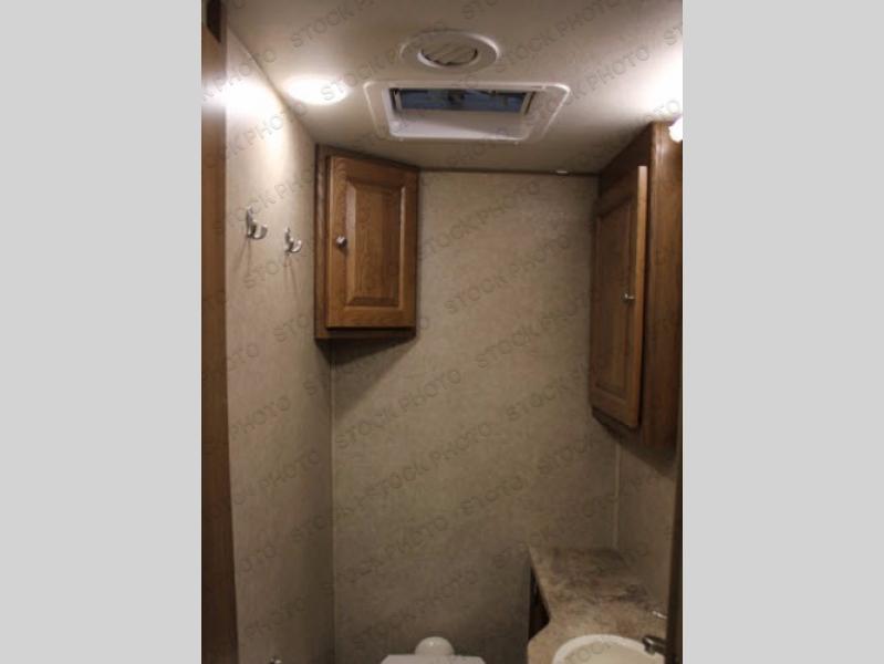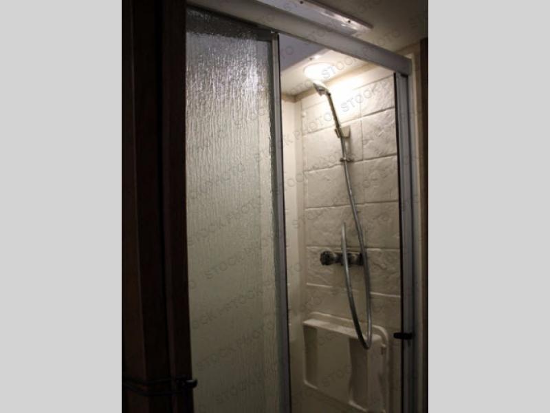 Head towards the rear of the coach and walk through the complete bath including a 32" shower on your left side, and a toilet with vanity and sink including a medicine cabinet on your right.