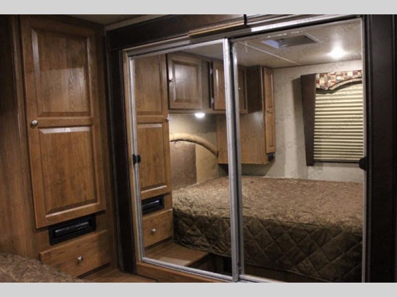 The master bedroom features a queen bed along the rear wall, bedside wardrobes, plus a nightstand on the left side, and a slide out wardrobe along the road side for all of your hanging clothes.