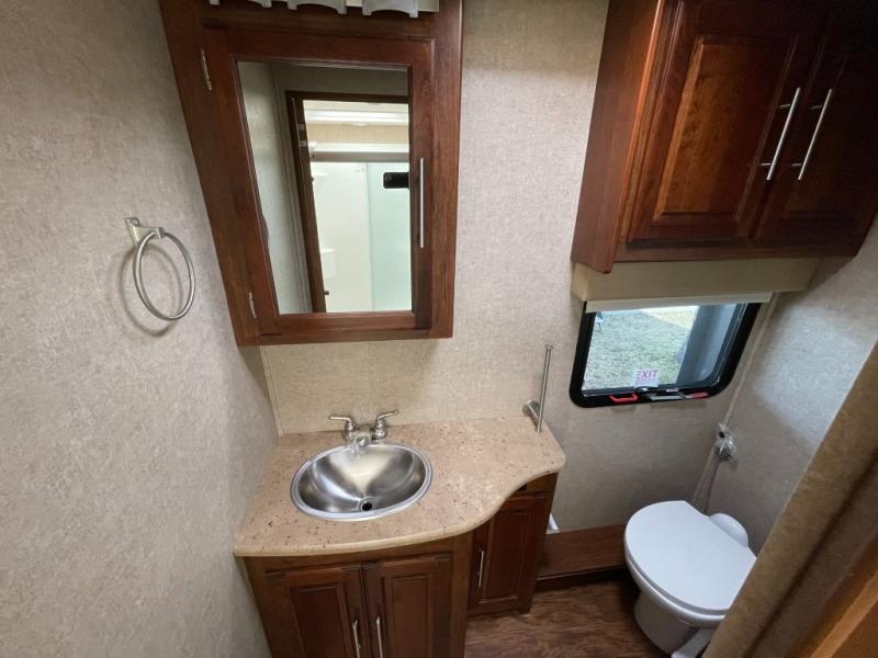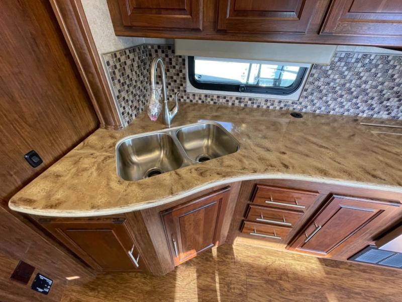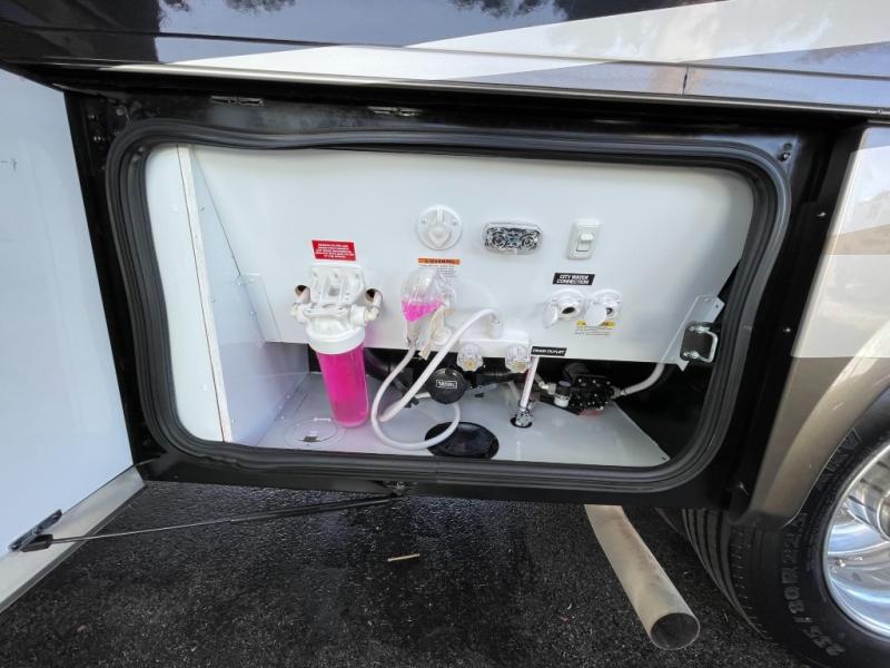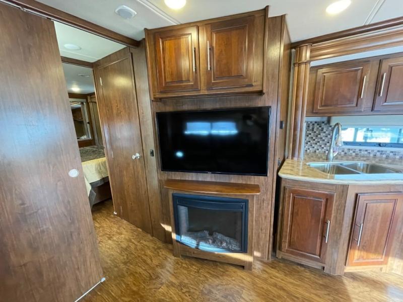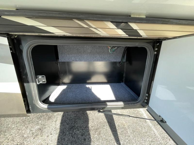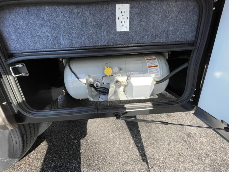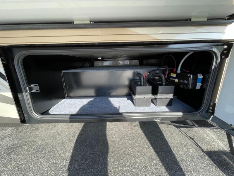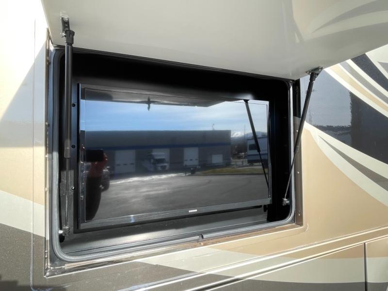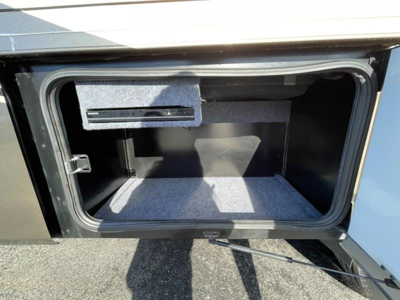 As you step inside, just behind the front passenger seat, you will feel the spaciousness thanks to dual opposing slides in front. There is a slide out 40" x 70" dinette and 70" sofa bed with footrests to the left of the door. The sofa features overhead storage, plus you can choose optional theater seating if you like instead. Opposite the sofa enjoy a 43" LED TV and fireplace along the angled outer bathroom wall which makes it perfectly viewable from any seating in the space.