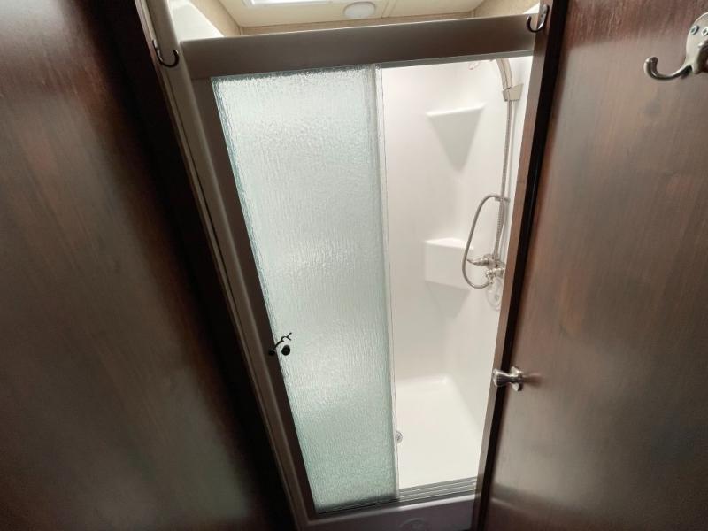 The bath is split and features a 38" x 30" shower on your left as you head toward the rear of the coach, and there is a private toilet and sink with overhead storage on the right side.