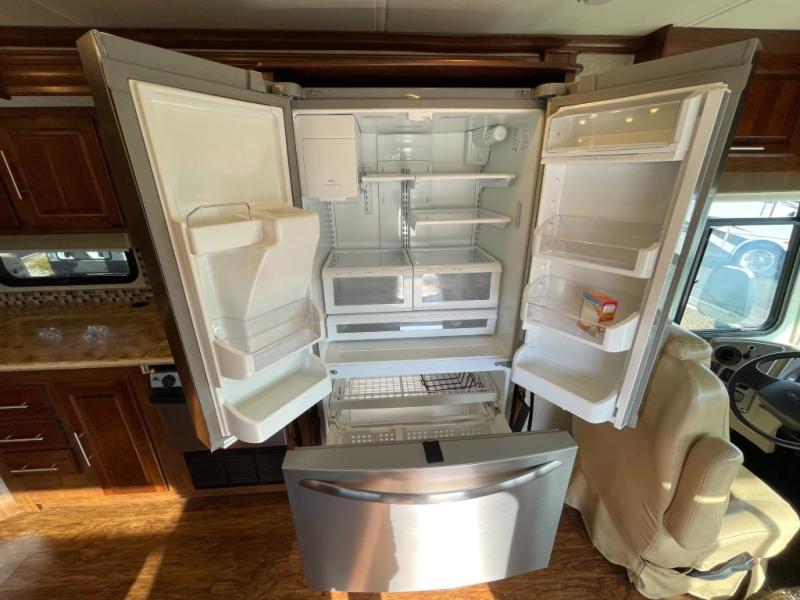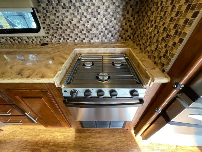 Opposite the door side, find a slide out kitchen including a residential stainless steel refrigerator, a three burner range, overhead convection microwave oven, and a double sink angled the same as the entertainment center. There is also plenty of overhead storage, plus counter space for food prep as well.