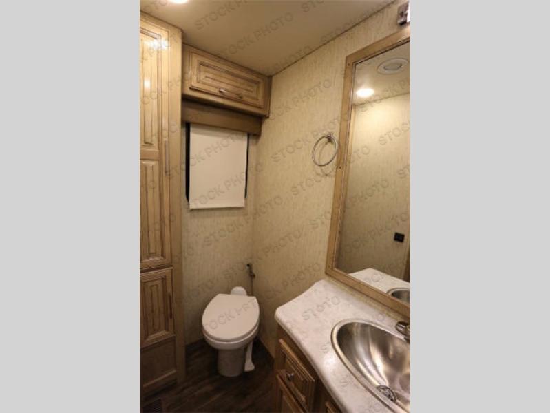 Opposite the refrigerator you will find a side aisle bath including a 34" x 34" radius shower, a toilet, and a vanity with sink. This is just the first of two full baths on board this class A coach!