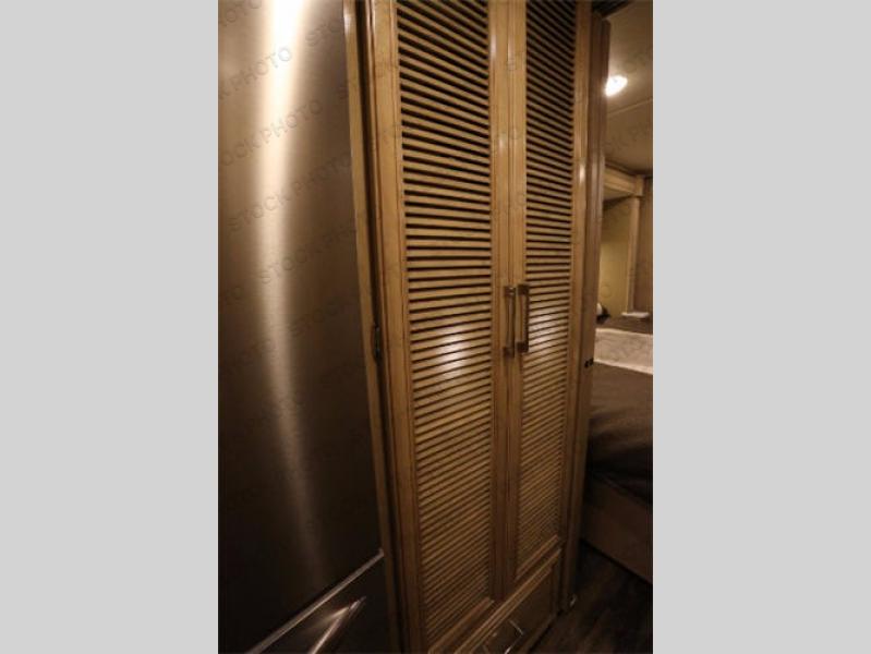 A sliding door divides the coach and creates a private master bedroom with en suite bath in the rear. The bedroom area features a slide out 70" x 74" king size bed along the curbside with overhead storage as well. Opposite there is ample storage space with a dresser and overhead cabinets, plus a 32" LED TV for your enjoyment.