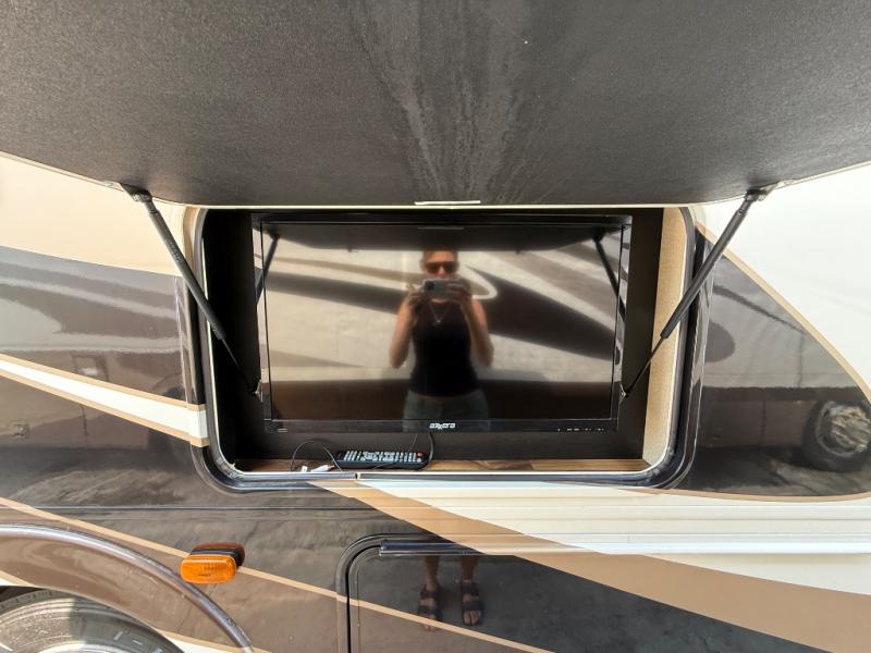 Step inside behind the passenger seat and take a look back. There is a 30" x 70" booth dinette with overhead storage along with a 32" LED TV for viewing to your immediate left. A 47" x 81" power drop down bunk over the cab area will readily provide more sleeping space when needed. You can also enjoy the cockpit table and computer workstation.
