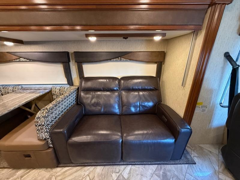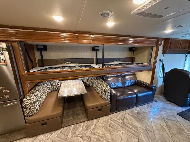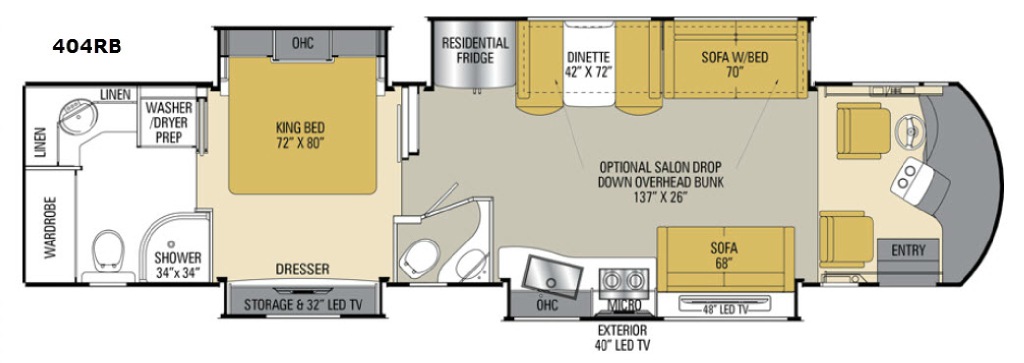 The road side features a second slide that provides a residential refrigerator, a booth dinette, and sofa with bed plus additional overhead storage. You may even choose an optional salon bunk in place of the overhead storage if you need more sleeping space. With all of this seating and sleeping area you will enjoy plenty of time to relax and enjoy your latest surroundings as you reminisce about the days adventure and begin planning the next.