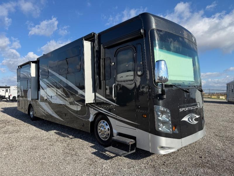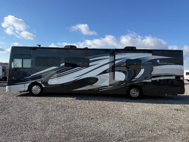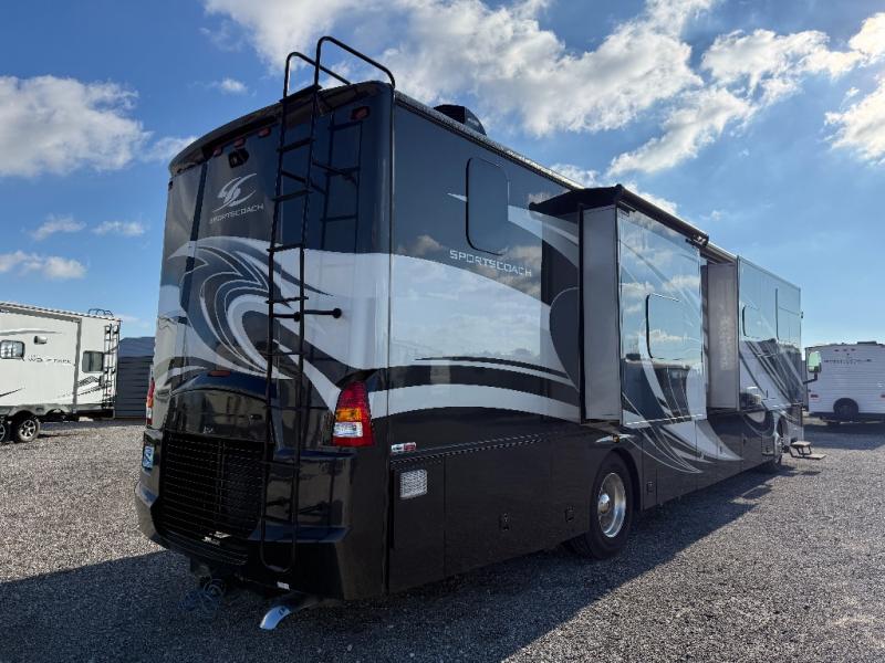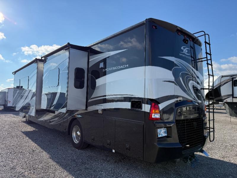 Step inside this Sportscoach Cross Country RD class A rear diesel coach and feel like you are still at home! Model 404RB features a spacious rear bath, a king size bed, and quadruple slides for added interior space, plus an additional half bath for convenience!