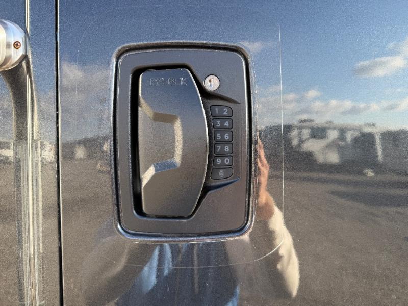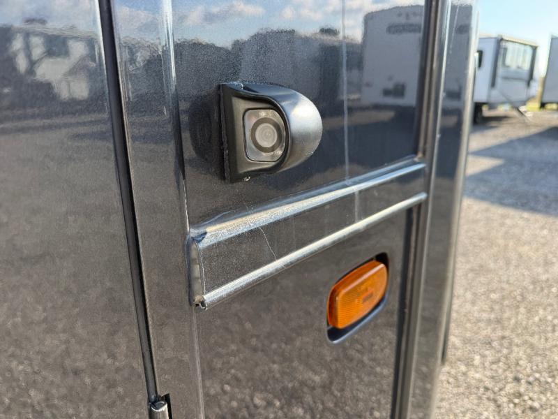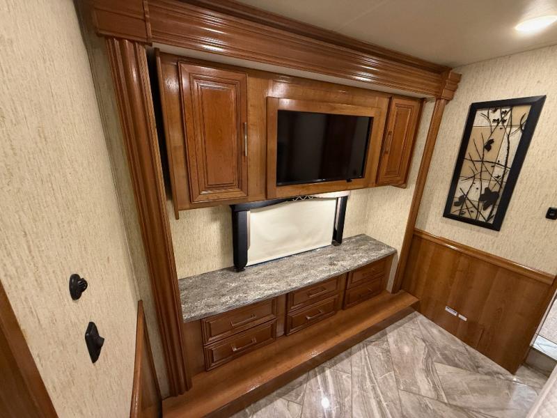 Head through the sliding doors to the private bedroom and rear master bath. The bedroom features a king bed slide with overhead storage. On the opposite side you will find a slide out dresser with a 32" LED TV and overhead storage.