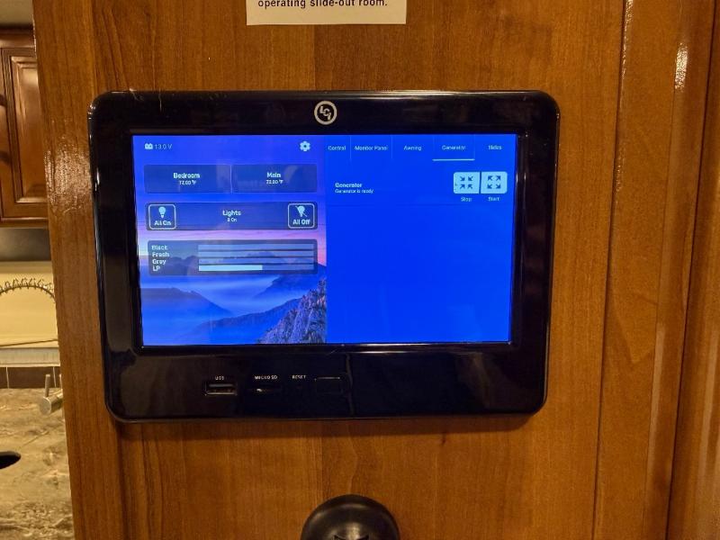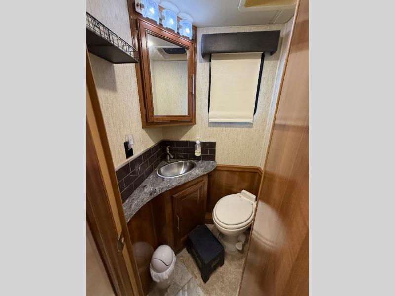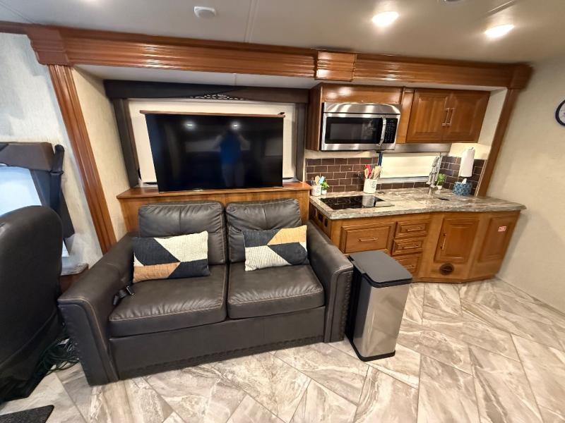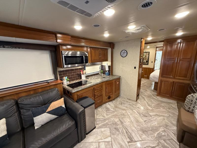 As you enter you will quickly feel the spaciousness with dual opposing slides opened up in the main living area. There is a slide out sofa with a TV above, a two burner cook-top with overhead microwave oven, and a kitchen sink along the curbside of the coach.