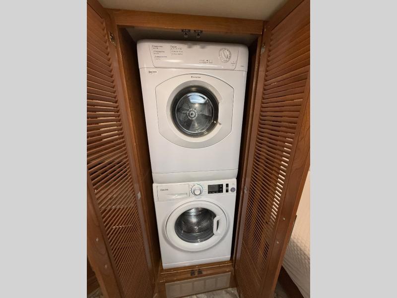 A second sliding door separates the bedroom from the rear bath where you will find a corner shower, a toilet, a large wardrobe, and corner vanity with sink. There is also an overhead linen storage, plus a space that has been prepped for a washer and dryer if you choose to add that option.