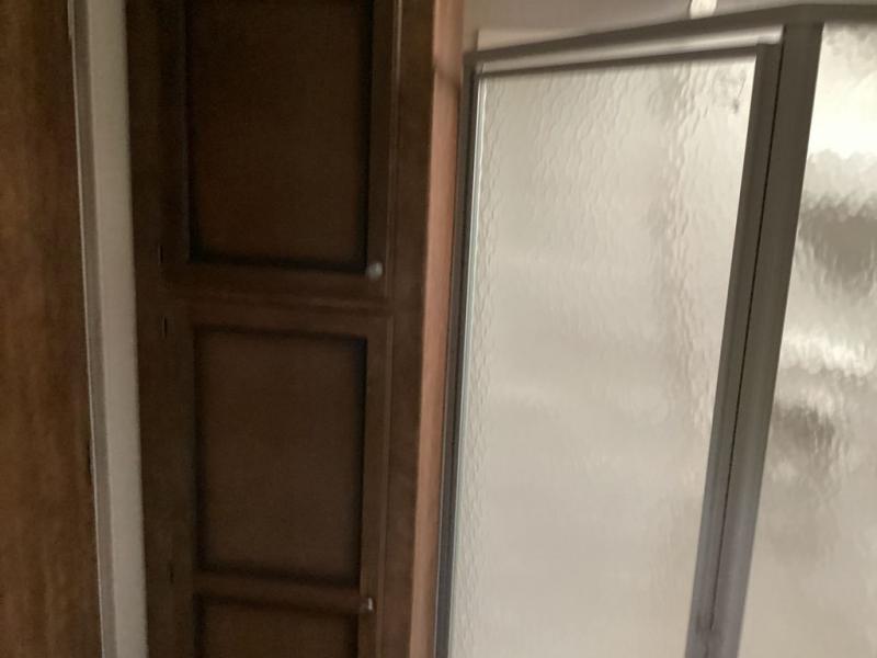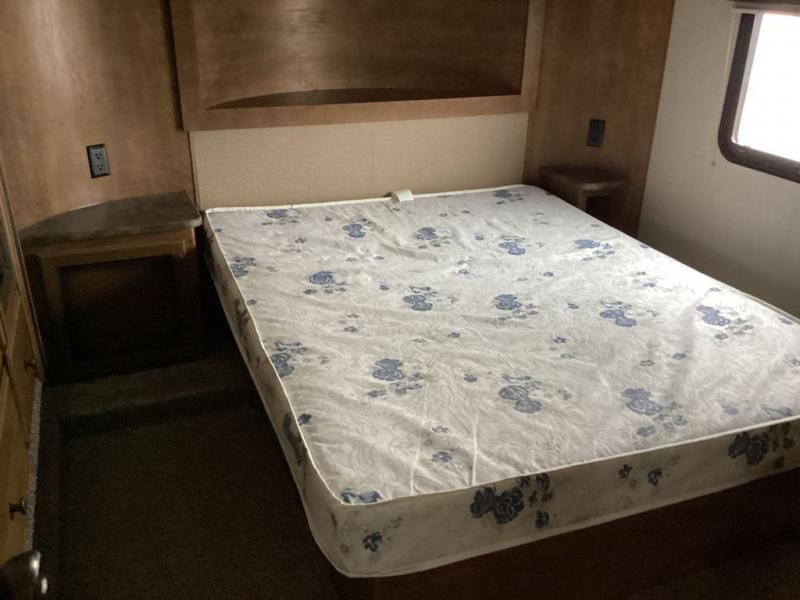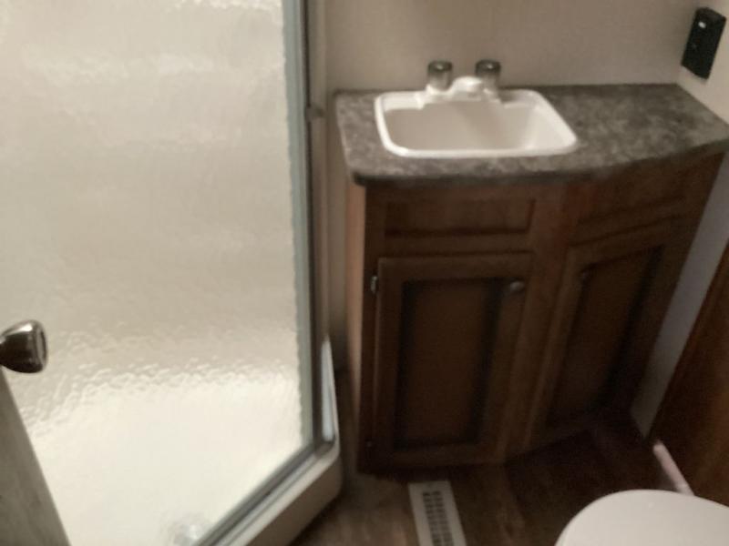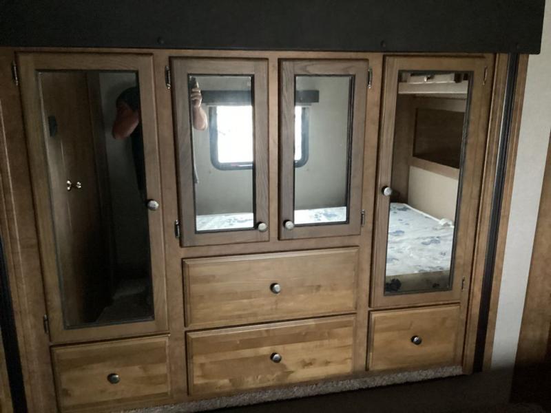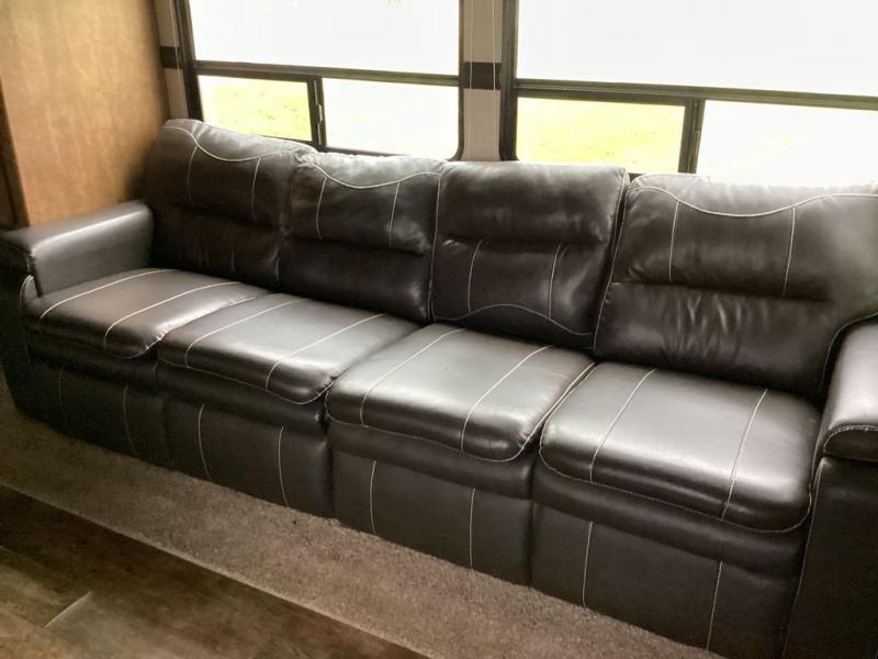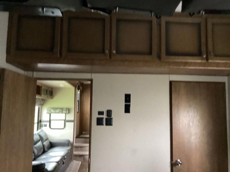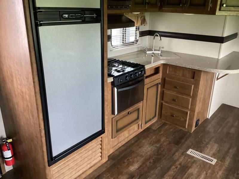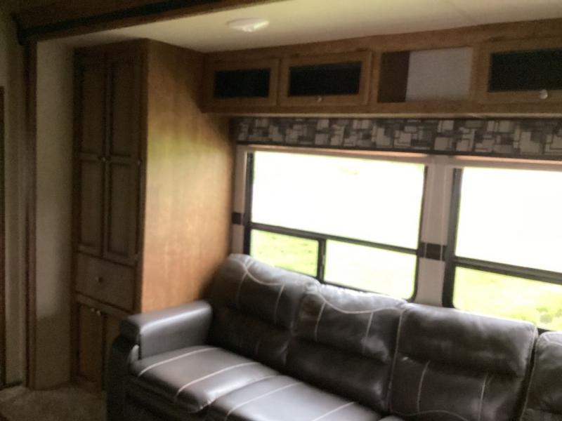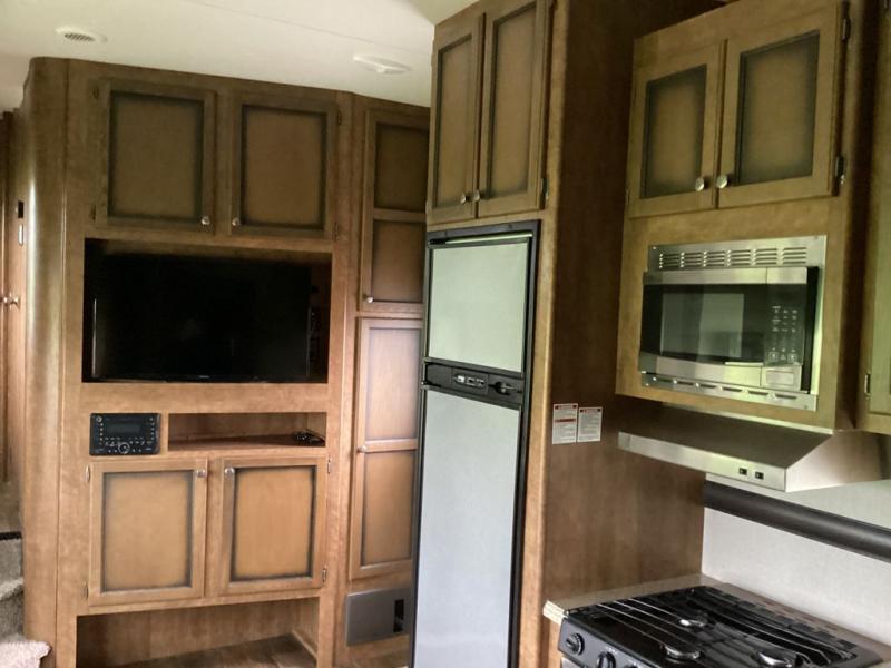 As you enter into the main living area to the right are two bar stools. Along one wall you will find a double kitchen sink, three burner range, microwave, and refrigerator. The opposite side of the fifth wheel has a large slide with a pantry and sofa. Near the entrance there is a convenient closet and entertainment center.