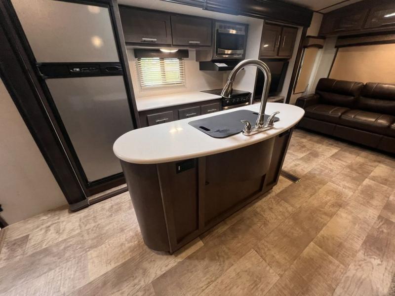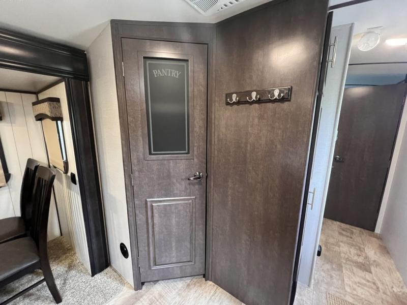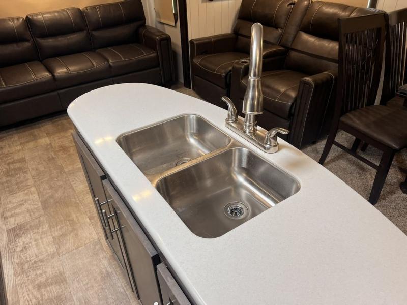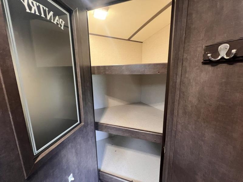 To the left of the entry door you will find a spacious combined kitchen and living area with dual opposing slides. The kitchen is along the curb side and features a refrigerator, a three burner range with overhead microwave oven, and cabinets for your daily dishes and things. There is also an off center island with a double sink, plus a large corner pantry for plenty of food storage and more.